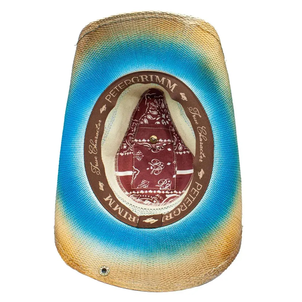 The feathers are elegantly secured by faux leather straps and metal pieces, adding a dash of rugged elegance to the hat's design. A hidden pocket nestled within the side crown, embellished with a paisley design, provides a discreet storage solution for small essentials such as keys or cash, ensuring you're always prepared wherever your adventures take you. At the forefront of the hat sits a decorative metal piece, commanding attention with its intricate detailing and adding a hint of sophistication to the overall look. Designed to accommodate most head sizes, this hat features an elastic band for a snug and comfortable fit. With a brim size of 3.5 inches, it offers ample protection from the sun's rays while maintaining a classic cowboy hat silhouette. Whether you're exploring the great outdoors or simply embracing your inner cowboy in urban settings, the Peter Grimm Karoli Distressed Blue Straw Cowboy Hat is the perfect blend of style and functionality, ready to accompany you on all your journeys with rugged charm.