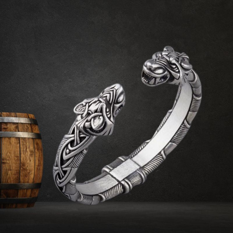 This beautiful hand-crafted Viking bracelet depicts the head of a wolf on each end. Wolves had great importance to Viking / Norse mythology, and this bracelet is representative of the monstrous wolf Fenrir who battles and slays Odin during Ragnarok (the end of the world). This style bracelet was actually worn by Viking people many centuries ago and is inspired by artifacts found on the Isle of Gotland (Sweden) and from dig sites in Iceland.
