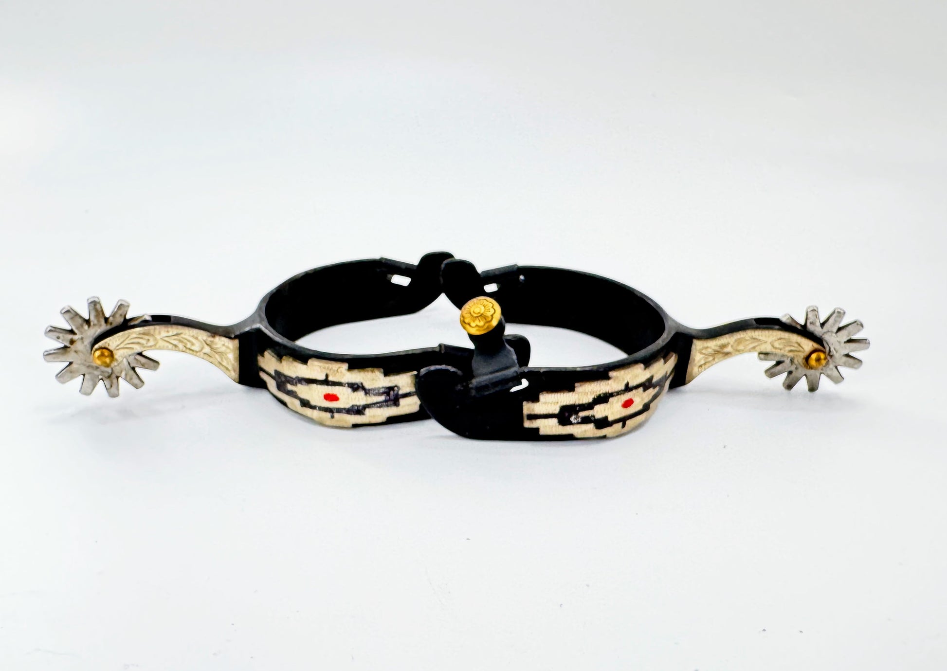 A well balanced black steel spur with a special 2 color southwestern, nickel silver overlay, Nickel silver overlay swinging buttons. *Comes as a pair*