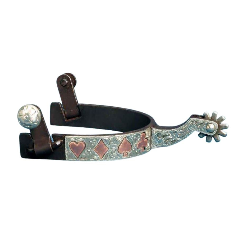 The Reno is a new look in spurs. Beautiful hand engraved nickel silver overlay with card suites inlaid in copper. 3/4" band with forward lean buttons and a 2" shank. 10 point 1" rowel. These spurs are unique and beautiful!