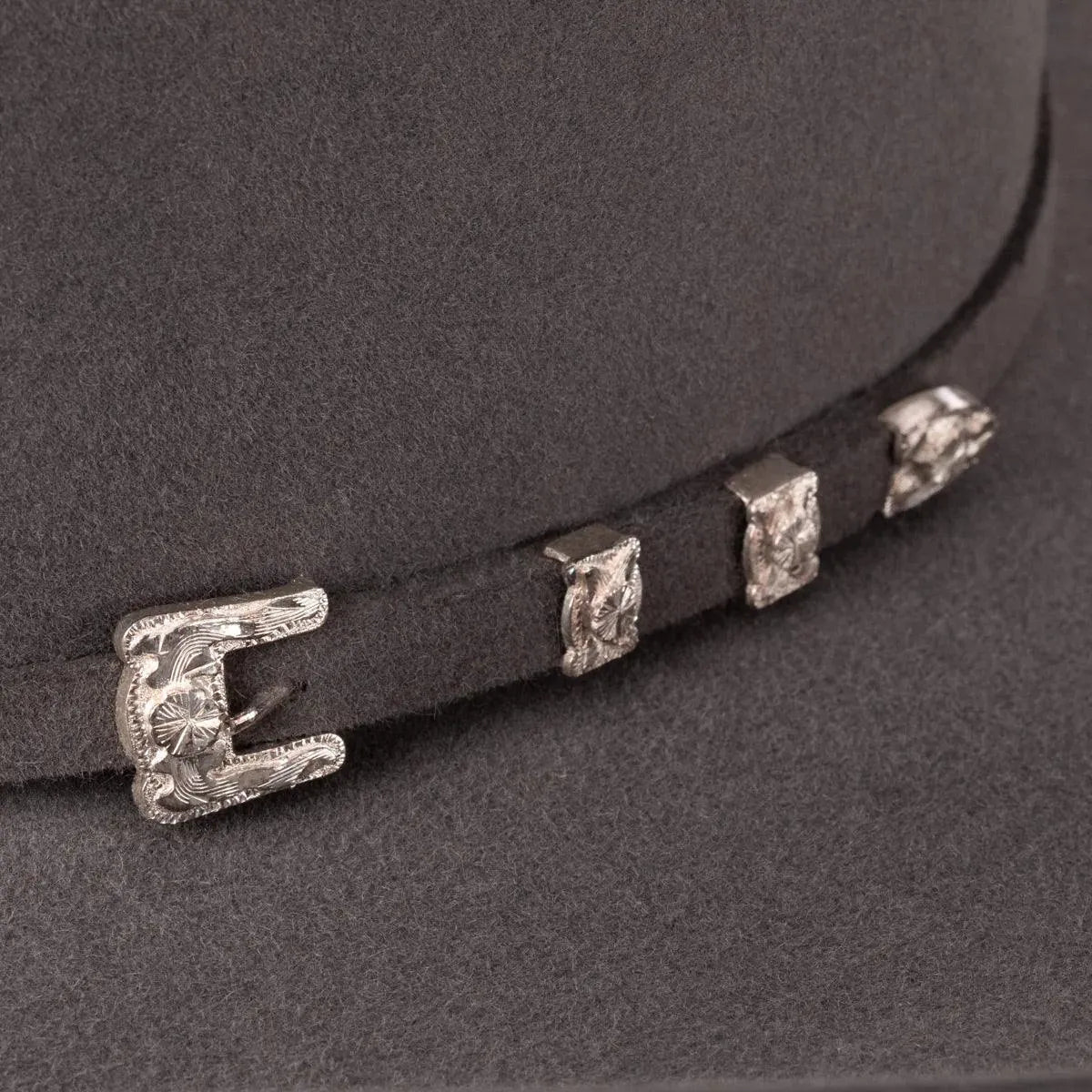 Slip into the George Strait Logan and your favorite pair of boots for a knock-out country look that's sure to impress. This amazing 6X domestic rabbit fur cowboy hat is made in the USA. It has 4 1/4” cattleman crown, profile 52, a 4” brim, and a self-match hatband with a elegant four-piece silver-toned buckle set. It comes with a Resistol hatbox.Shown in Charcoal with a 4 1/4” brim.