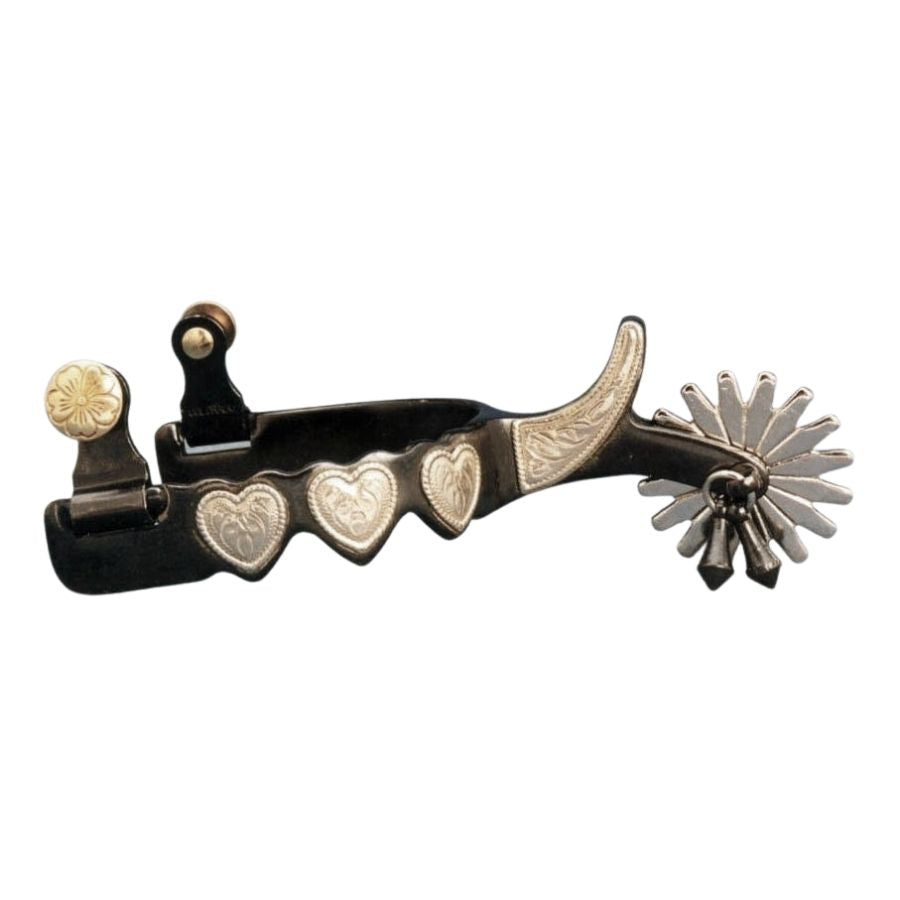 A beautiful midnight blue spur with a three heart shaped band with overlayed nickel silver hearts. 2 " shank and 2 1/8" stainless steel rowels and jingle bobs.