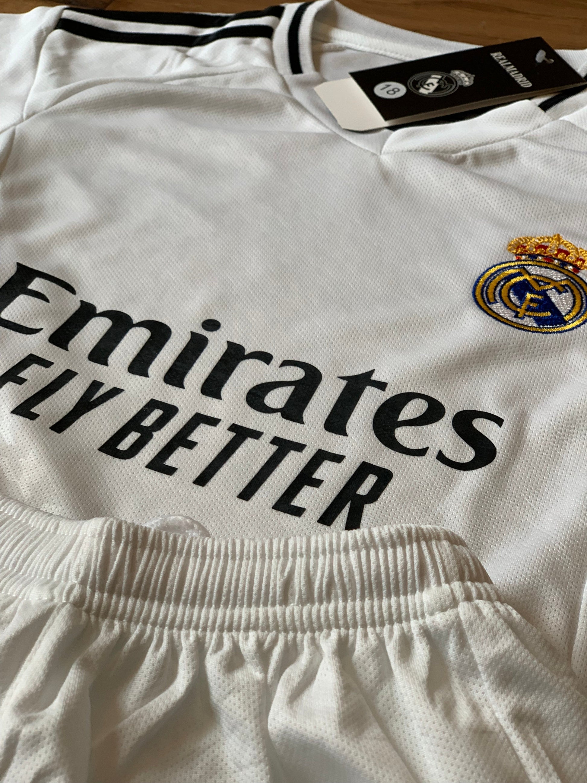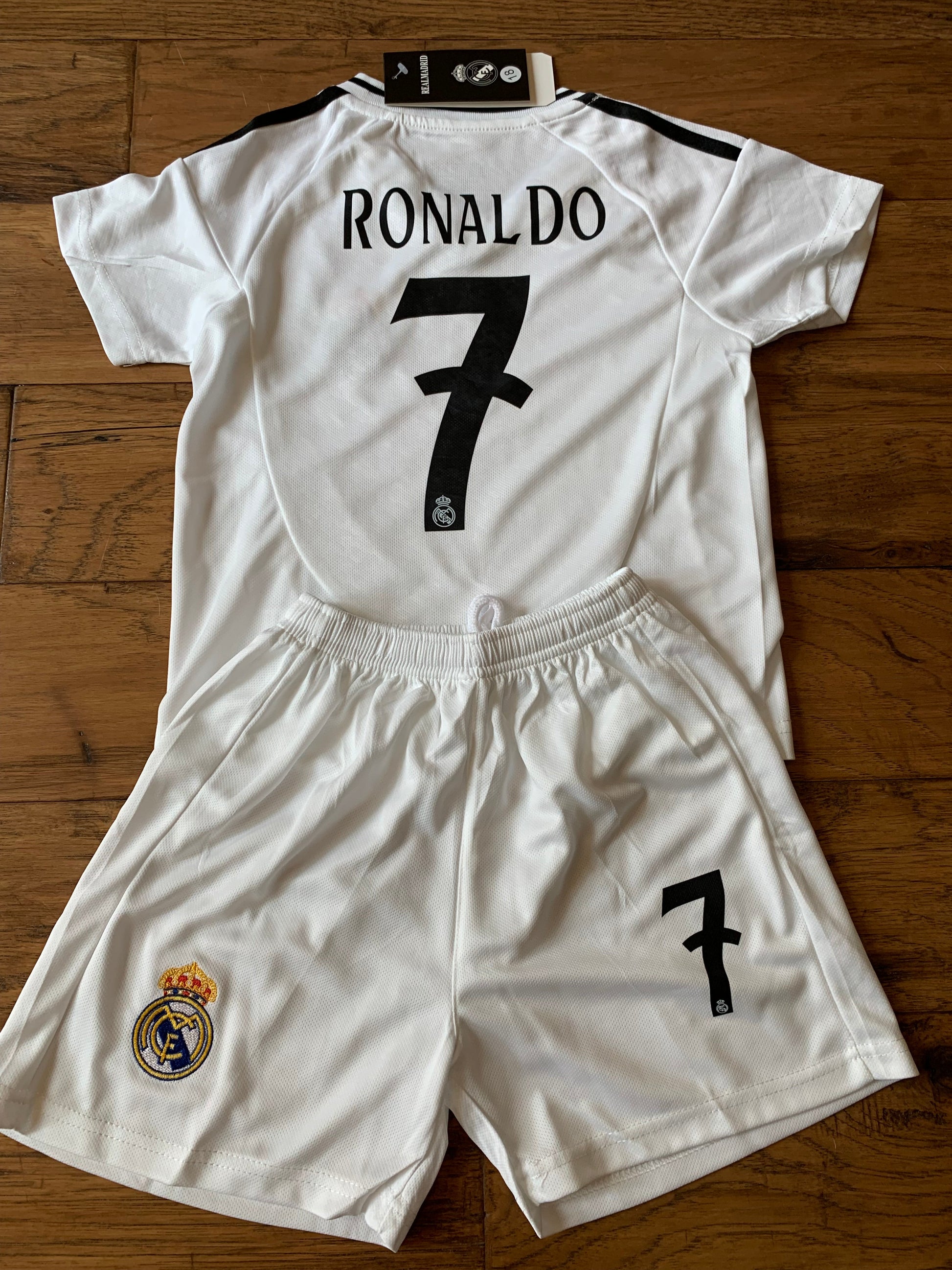 HOT! One of our best sellers hands down. Many records set in this beautiful Kids Jersey! Allow your KIDDO peak performance while putting this jersey on his back, an instant finger snap and boom faster, kicks harder, and plays better! In 99% of our customers :). White Ronaldo Kids Soccer Jersey Real Madrid Youth Toddler Sizes. Football Youth Toddler Football Shirt and Shorts matching set. Toddler Youth Tshirt Awesome Youth Soccer Jersey and shorts set of 2. Size 2T, 3T, 4T, 5T, 18, 20, 22, 24, 26, 28, 30. All in stock ships within 12 hours from order time. We ship from Missouri. All soccer jerseys are brand new and never tried on. Amazing Screen Printing & Embroidery.