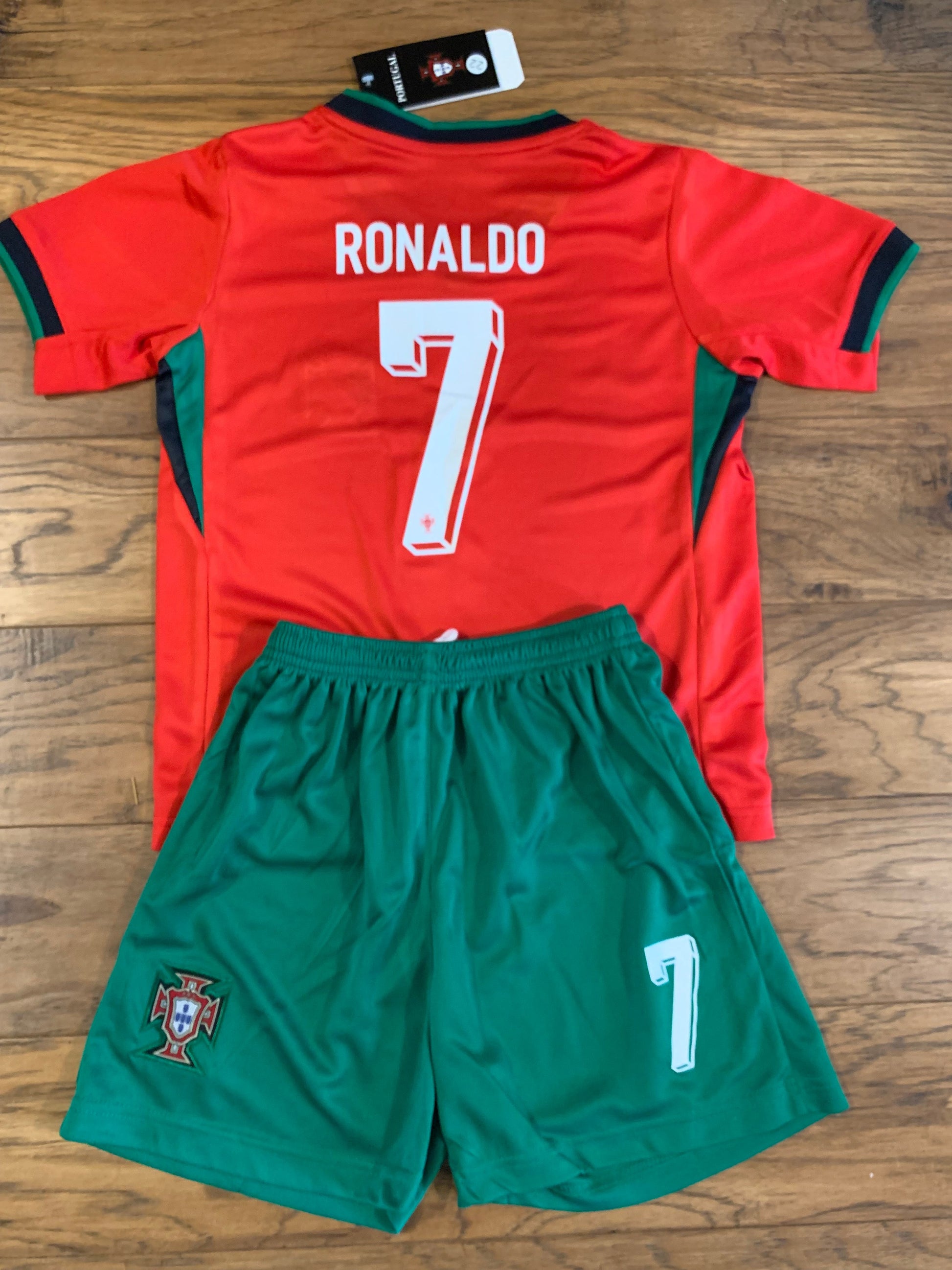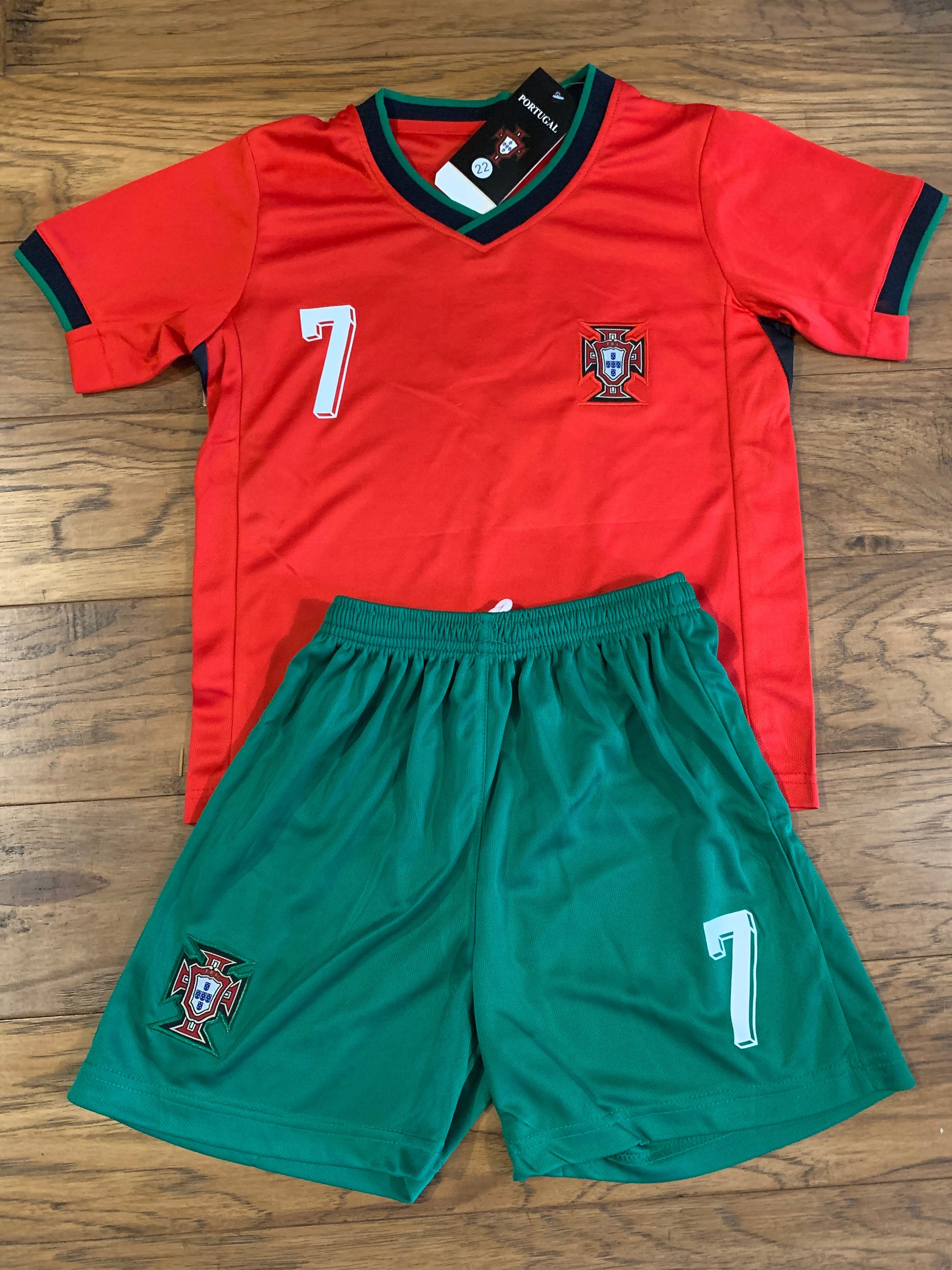 Ronaldo Portugal Home Kids Youth Soccer Jersey Kit 2 Piece Set. Football Youth Toddler Football Shirt and Shorts matching set. Toddler Youth Tshirt Awesome Youth Soccer Jersey and shorts set of 2. Size 2T, 3T, 4T, 5T, 18, 20, 22, 24, 26, 28, 30. All in stock ships within 12 hours from order time. We ship from Missouri. All soccer jerseys are brand new and never tried on. Amazing Screen Printing & Embroidery.