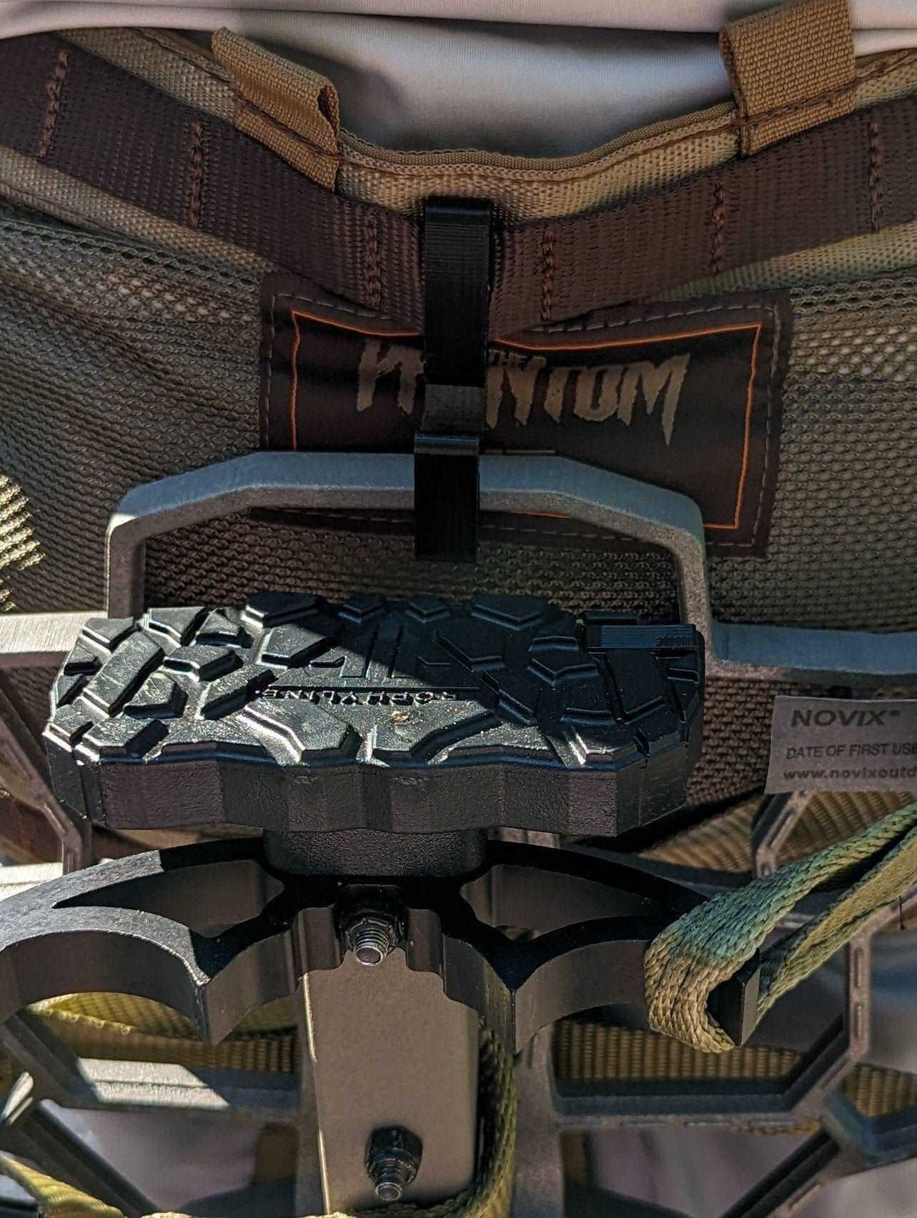 Molle/Saddle platform hanger/hook. Please select platform depth/thickness you need. Hanger is 1/2" wide and 3D printed with PETG filament. Pictured with hanger is a Trophyline EDP platform which uses a 3/4" size (saddle and platform not included).