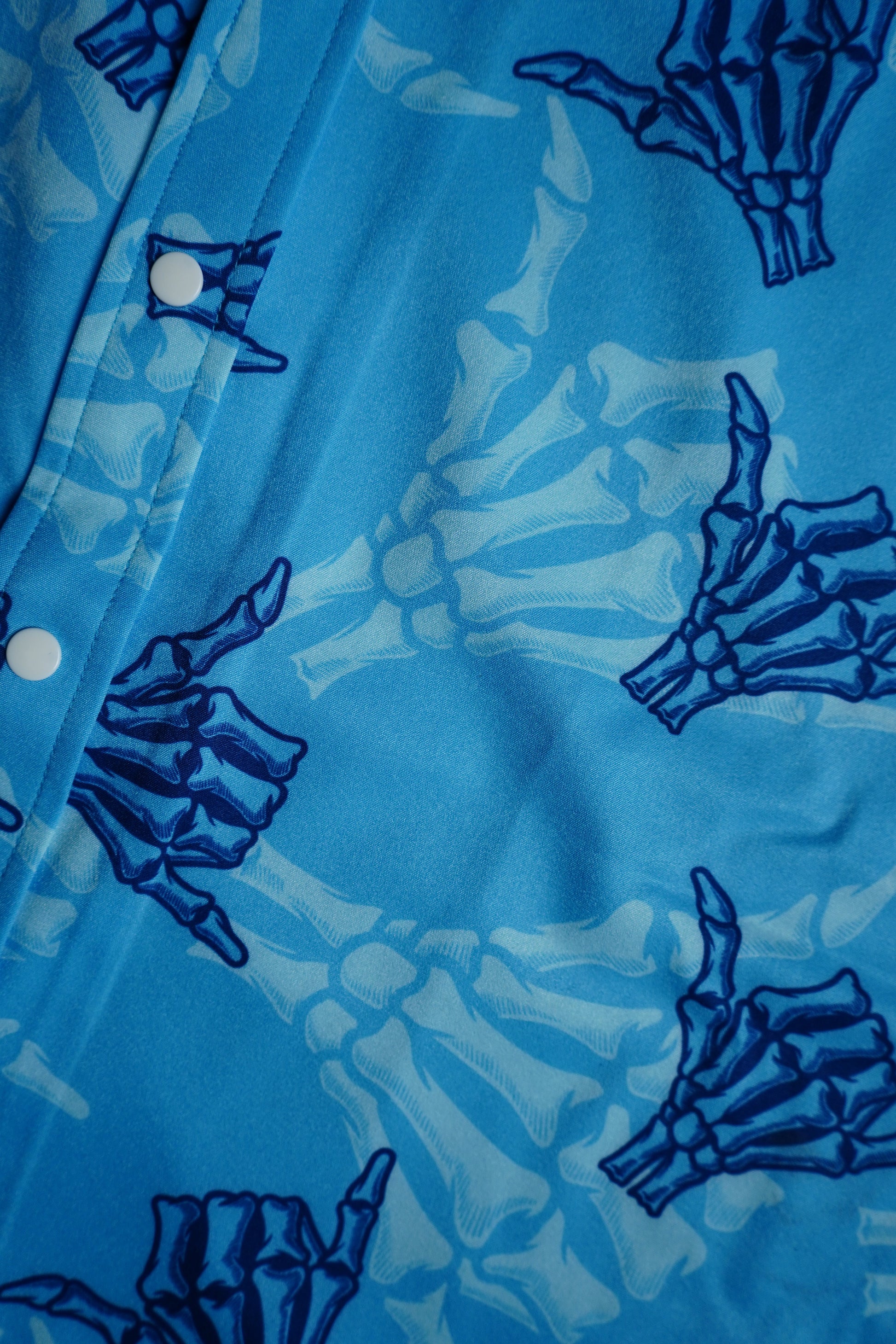 Stay deadly fresh with the Send It button-up, designed for those who demand comfort and edge. Crafted from a polyester/spandex blend, it offers durability and stretch for all-day wear. Its relaxed fit and lightweight, breathable fabric keep you cool, while snap buttons add a tactical touch. Weighted inner pockets ensure a smooth sweep-to-weapon motion (weight not included). Featuring a bold blue skeleton hand "hang-loose" print and a practical left breast pocket, this short-sleeve oxford is built for action and attitude.