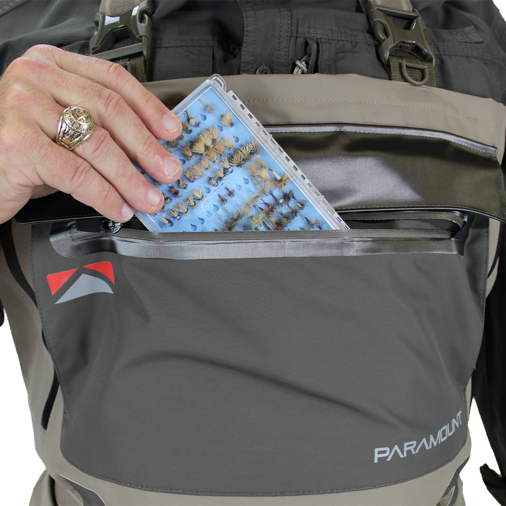 - 2 TOP ENTRY CHEST POCKETS with XL zippered fly box pocket plus hook and loop pocket