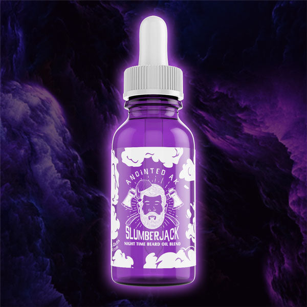 Product Info: 1 Fl. Oz. of Slumberjack Beard Oil in a Purple Glass Bottle