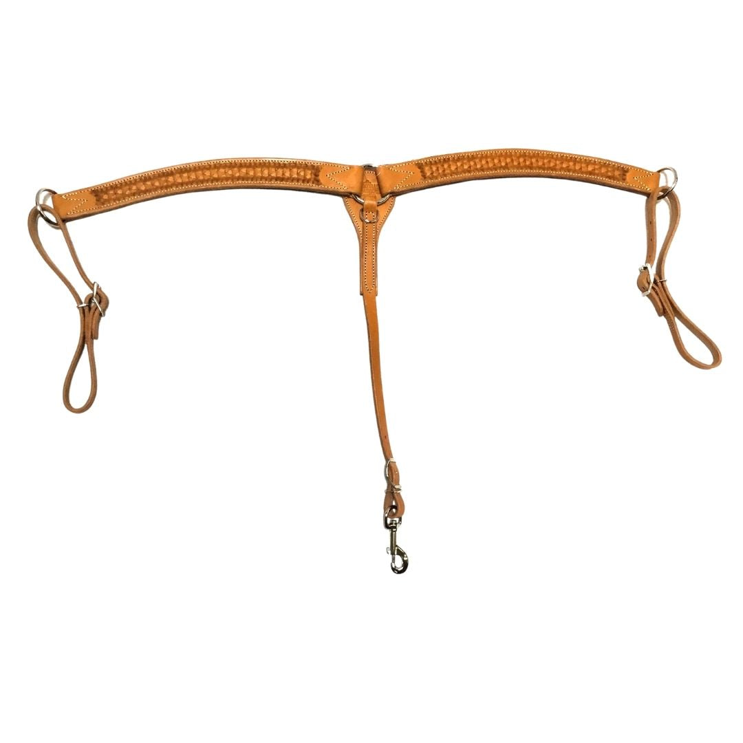 Beautiful light oiled barrel styled breast collar. Great for all disciplines. 1 1/2" chest straps with tie down strap tapered from 1 1/2" to 3/4". Snowflake Stamping.