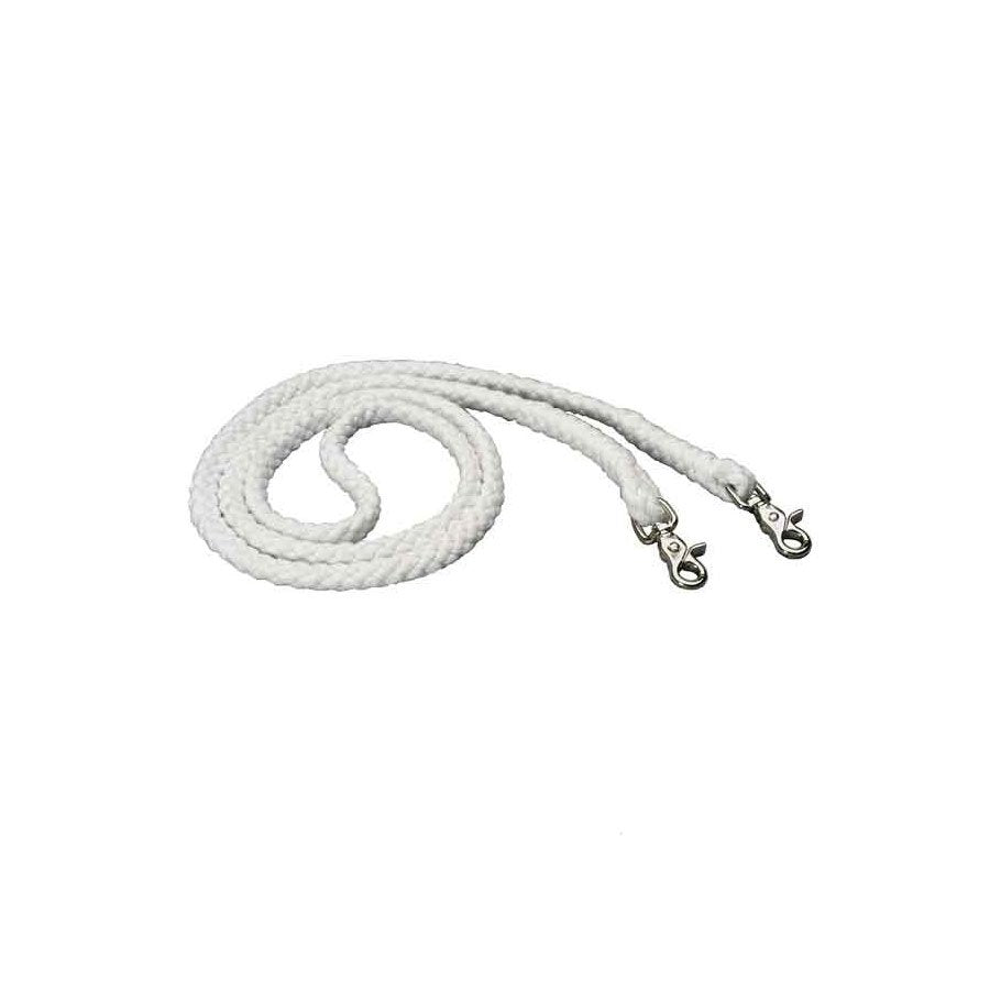 Our 'Stay-Soft" reins are made of soft spun, 1/2" poly rope with nickel plated rein snaps and braided back on both ends. Sold as 8' length. Strong yet very supple and soft on the hands. Made in the U.S.A.