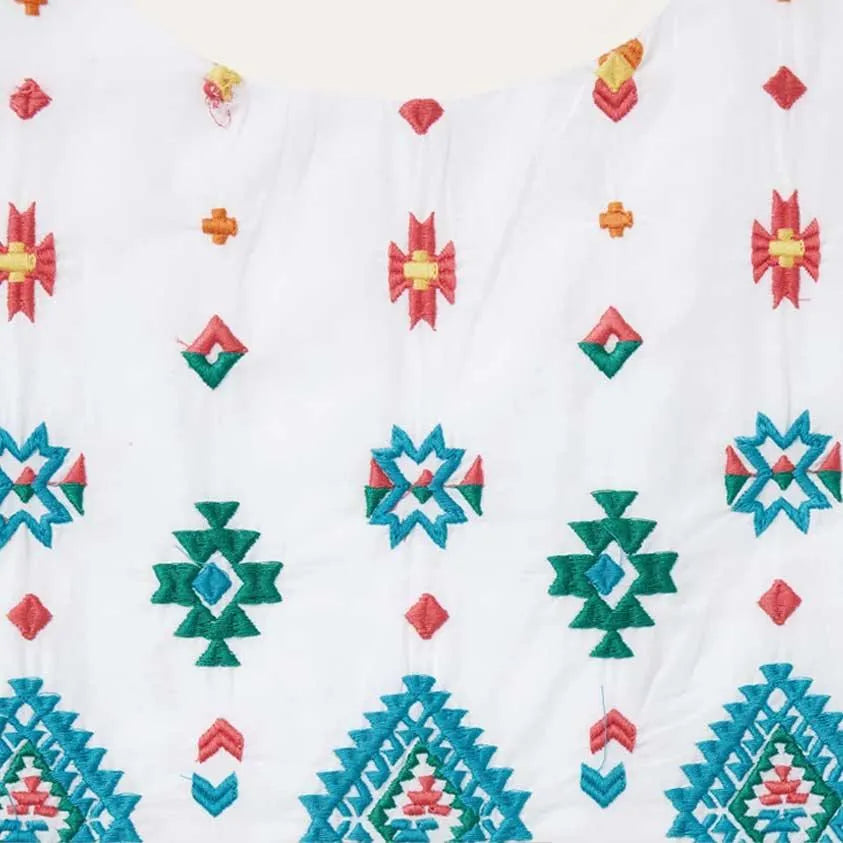 Embrace the laid-back yet vibrant country spirit as you wear this delightful dress. Its colorful embroidered modern Aztec pattern, featuring vibrant hues of red, yellow, and turquoise, adds a touch of Western flair. Crafted from smooth, high-quality white cotton lawn fabric, this dress offers lightweight comfort, making it an ideal choice for warm-weather gatherings.
