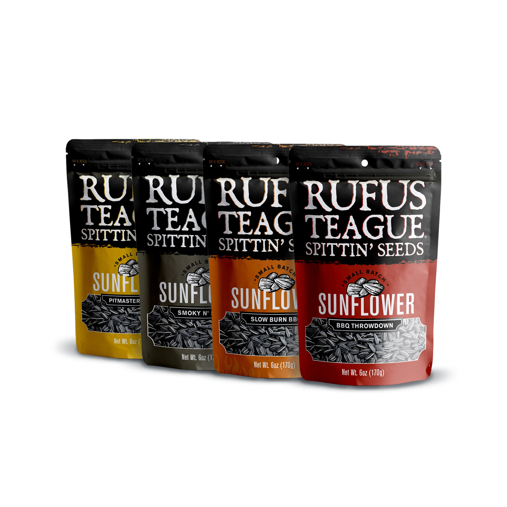 Stock up on all FOUR flavors of our amazing "Spittin' Seeds". You'll get a whole mess of our famous Rufus Teague BBQ flavor baked right into top-notch sunflower seeds. And each comes in a resealable, stay-fresh pouch that's perfect for camping, hunting, fishing, working outdoors and making your back pant pocket look cool.