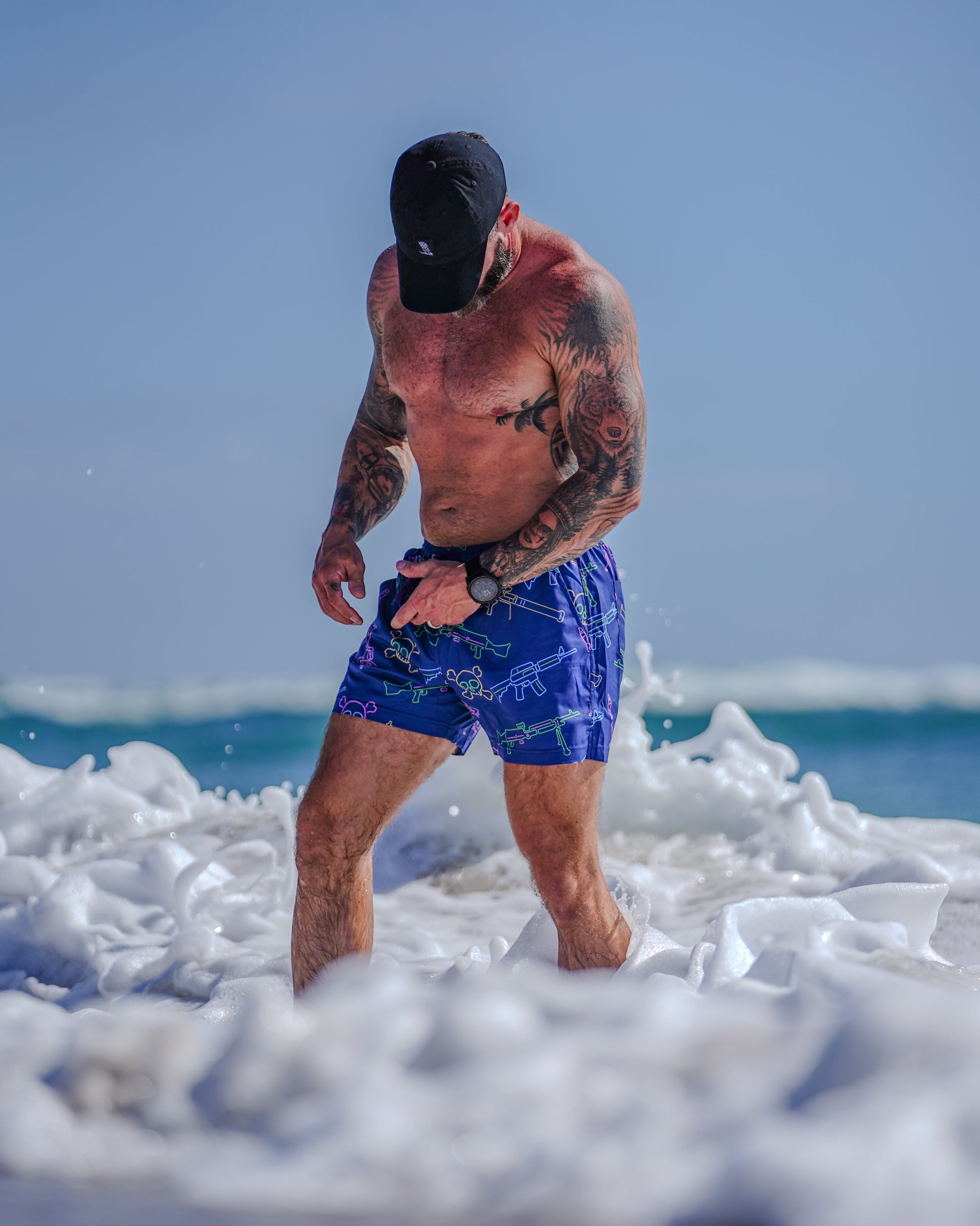 These Neon Lights & Gun Fights swim trunks deliver rugged style and high performance. Made from lightweight, quick-drying polyester/spandex, they ensure durability and a comfortable fit. The 5.5-inch inseam and elastic waistband with a silicone-dipped drawstring provide secure, flexible wear. Equipped with four external pockets and a hidden waistband stash pocket, they keep essentials close without slowing you down. The dark blue fabric features a striking multi-colored skull and munition pattern, perfect for those who demand bold, unapologetic edge in their swimwear.