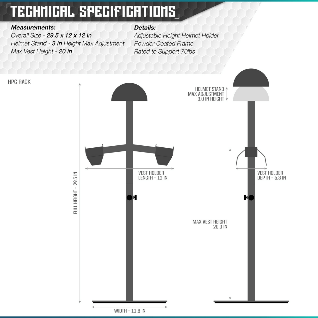 Compact, Space-Saving Tactical Display: Sized for desks, countertops, and workbenches, the Tabletop Gear Rack offers a professional way to display your helmet and vest setup without taking over your room. It’s perfect for personal collections, home office décor, or staging your gear before a day at the range.