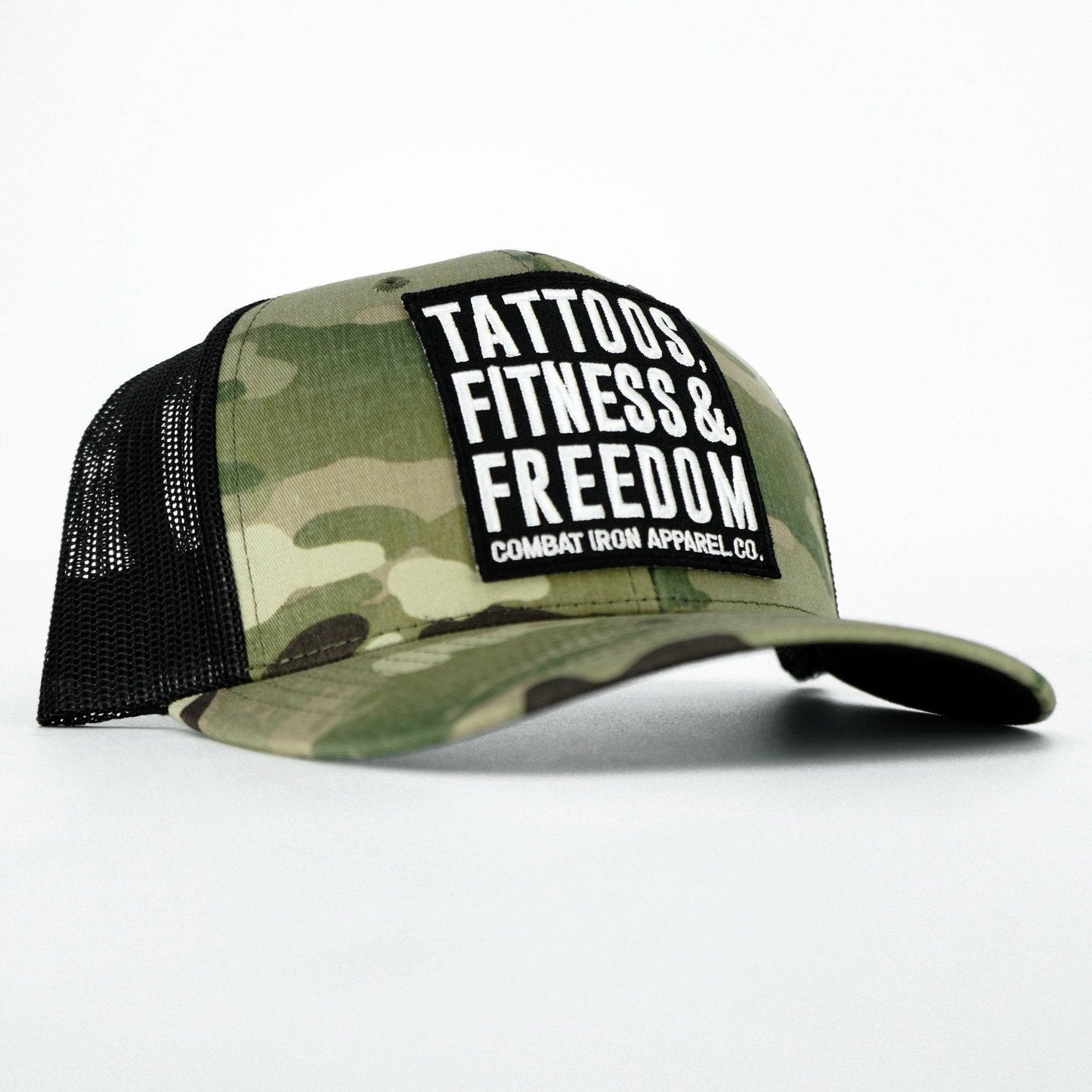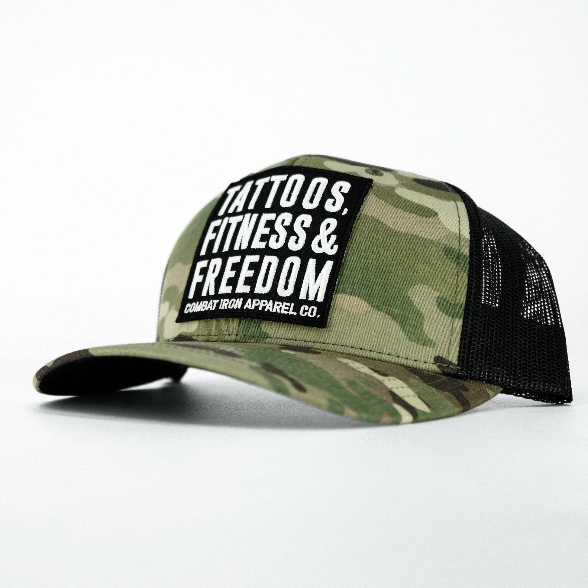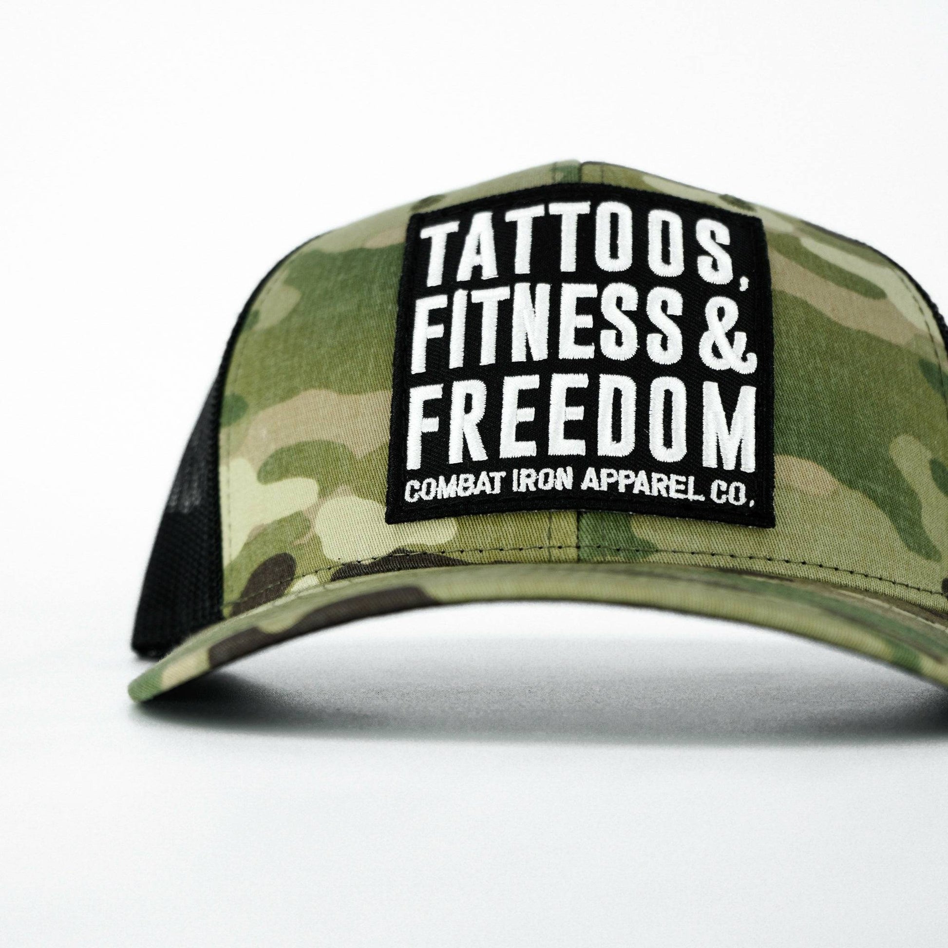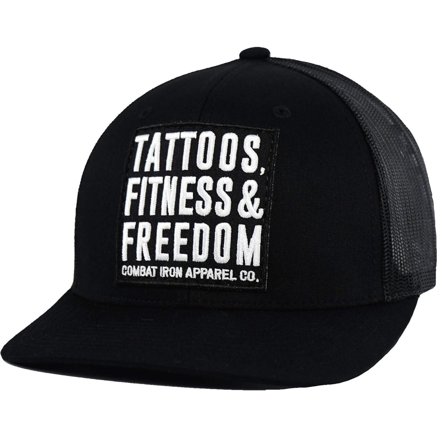 Perfect gym hat or range day headwear to display some of your favorite hobbies: Tattoos, Fitness and Freedom! All three are exciting topics to discuss, partake in & enjoy. Rear is made with breathable polyester mesh and a secure plastic snapback for a one-size-fits-all approach, these are professionally designed for to fit almost anybody. With a slight front bend and button closure located on top, these are commonly used during everyday wear, tactical events, training sessions and sporting activities.