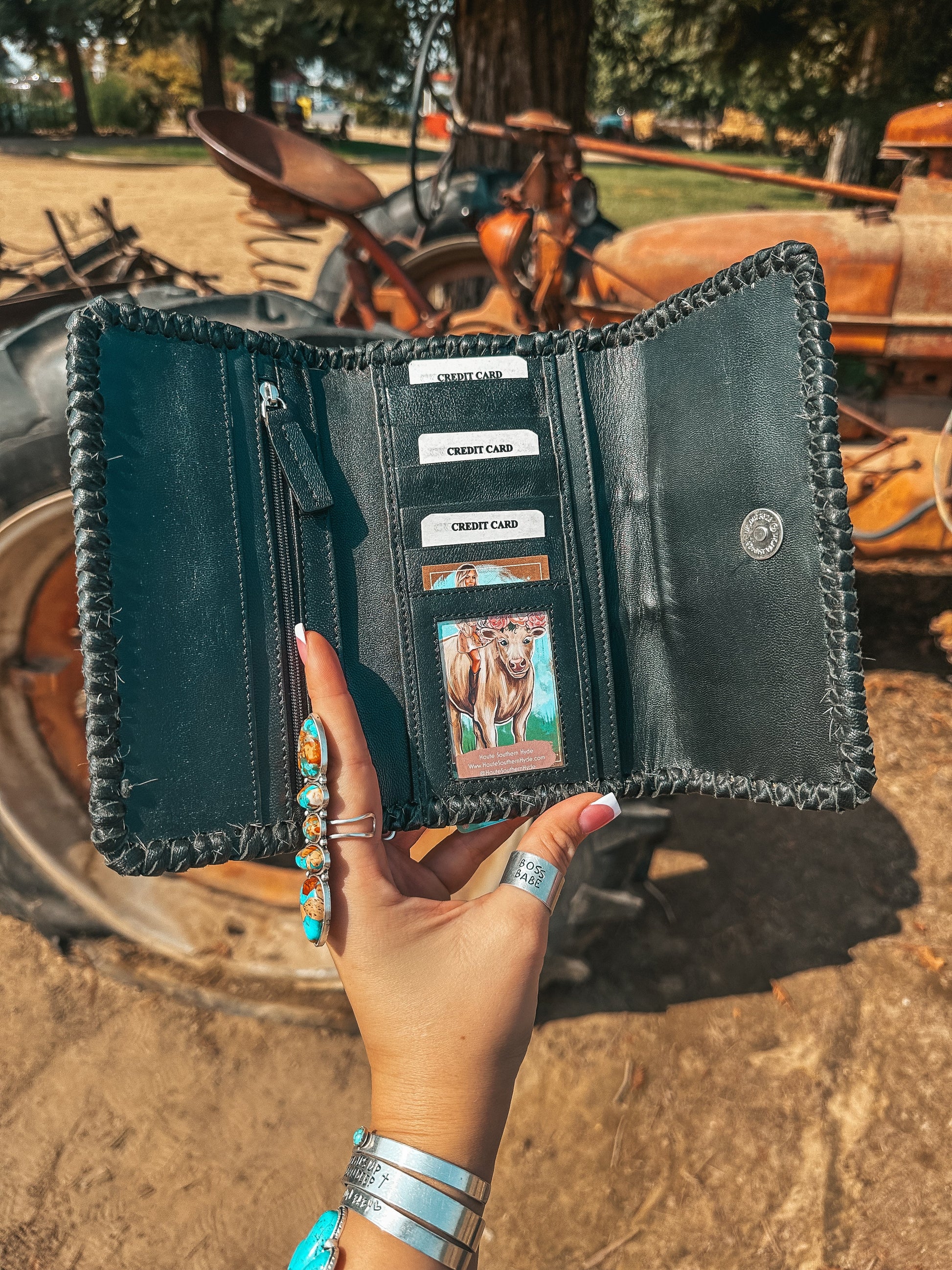 Sometimes a Hyde is just the vibe, and hand woven leather exemplifies the simplistic nature of this design. Introducing the Black Hazy Full Ryder, a Haute Southern Hyde by Beth Marie Exclusive. Designed by the owner Beth Marie, this wallet was made for the everyday western fashion gal. She features a snap closure, a zipper for your loose change, and 6 slots for your cards. 1 of those being clear to hold your I.D. Card.