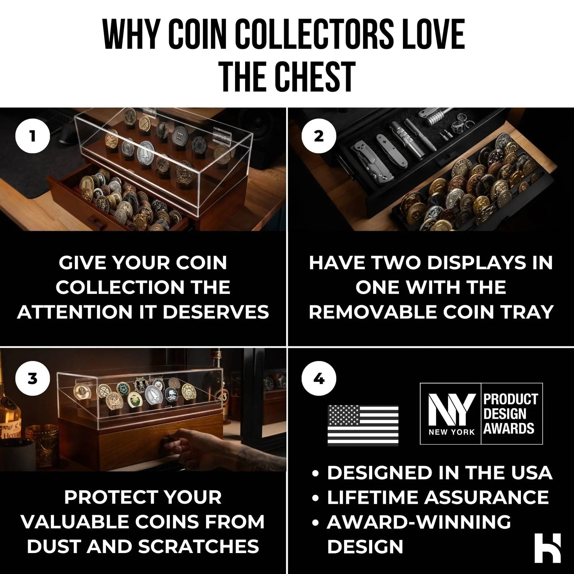 - PREMIUM CRAFTSMANSHIP, UNMATCHED QUALITY — The Chest is not just another coin display option. It's built to endure generations of admiration, reflecting our dedication to precision and meticulous craftsmanship. Every detail has been refined based on feedback from our community of 10,000+ collectors. With a history of creating award-winning designs, there's simply no other brand that matches what we do.