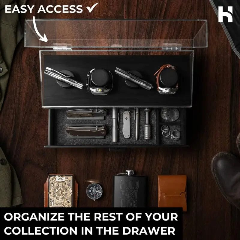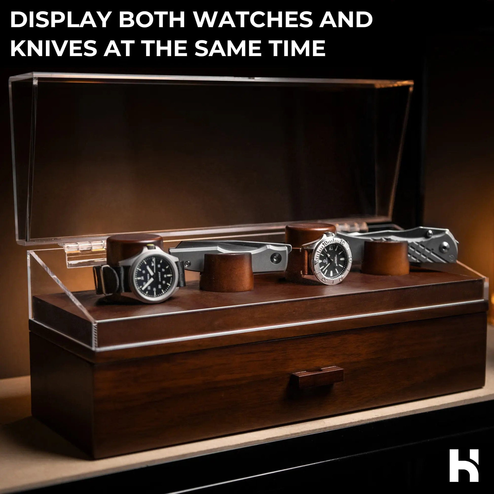 The transparent acrylic cover stands at a 90-degree angle, so you can easily select your timepiece or knife from your watch boxes.