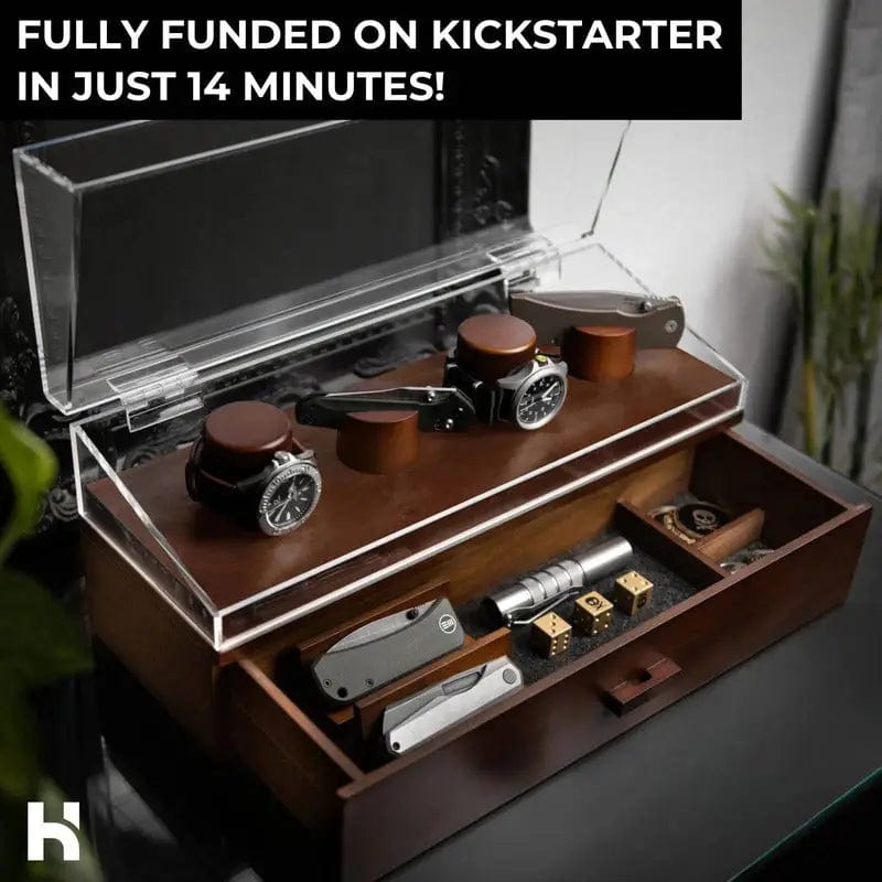 The Combo Deck is a customizable watch and pocket knife organizer, allowing you to mix and match your watches and knives, in one place.
