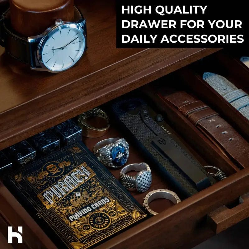 Below deck, you'll find a large drawer that opens and closes with ease for storing all your accessories such as watch straps, links, AirPods, keys, coins, cards, hopes and dreams.