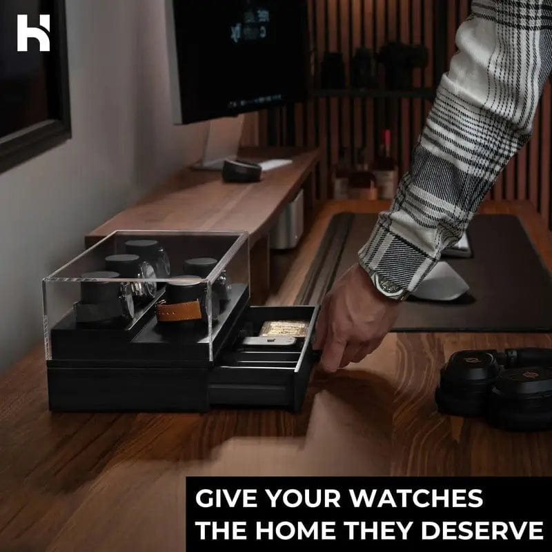 The top of the deck of the watch display case is enclosed with an acryclic lid that gives you a 360-degree view of your watch collection while protecting them from harmful dust particles to extend their longevity and retain their value (upgrade to Curator Pro for hinged case and vegan leather paddings).