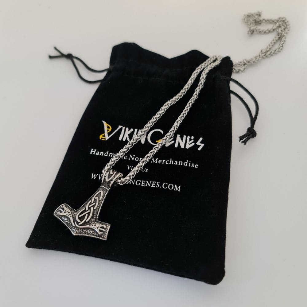 The Viking word Mjölnir means "Crusher", and was the name of the magical hammer wielded by Thor, the son of Odin. This large double-sided pendant pays homage to that mighty weapon, and has some beautiful woven dragon-beast artwork. This is a truly beautiful and unique treasure! A pendant of great design and symbolism.