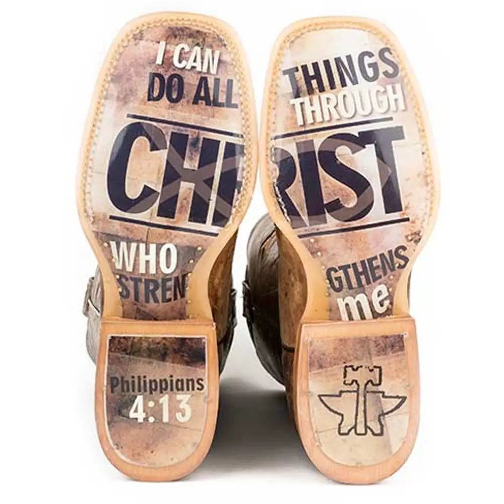 The Tin Haul Ichthys Aroundus With 4:13 Sole Men's Leather Cowboy Boot is a true testament to faith and craftsmanship, designed for those who walk with purpose. Handcrafted from genuine leather, this boot combines classic Western style with modern details that make it a standout piece.
