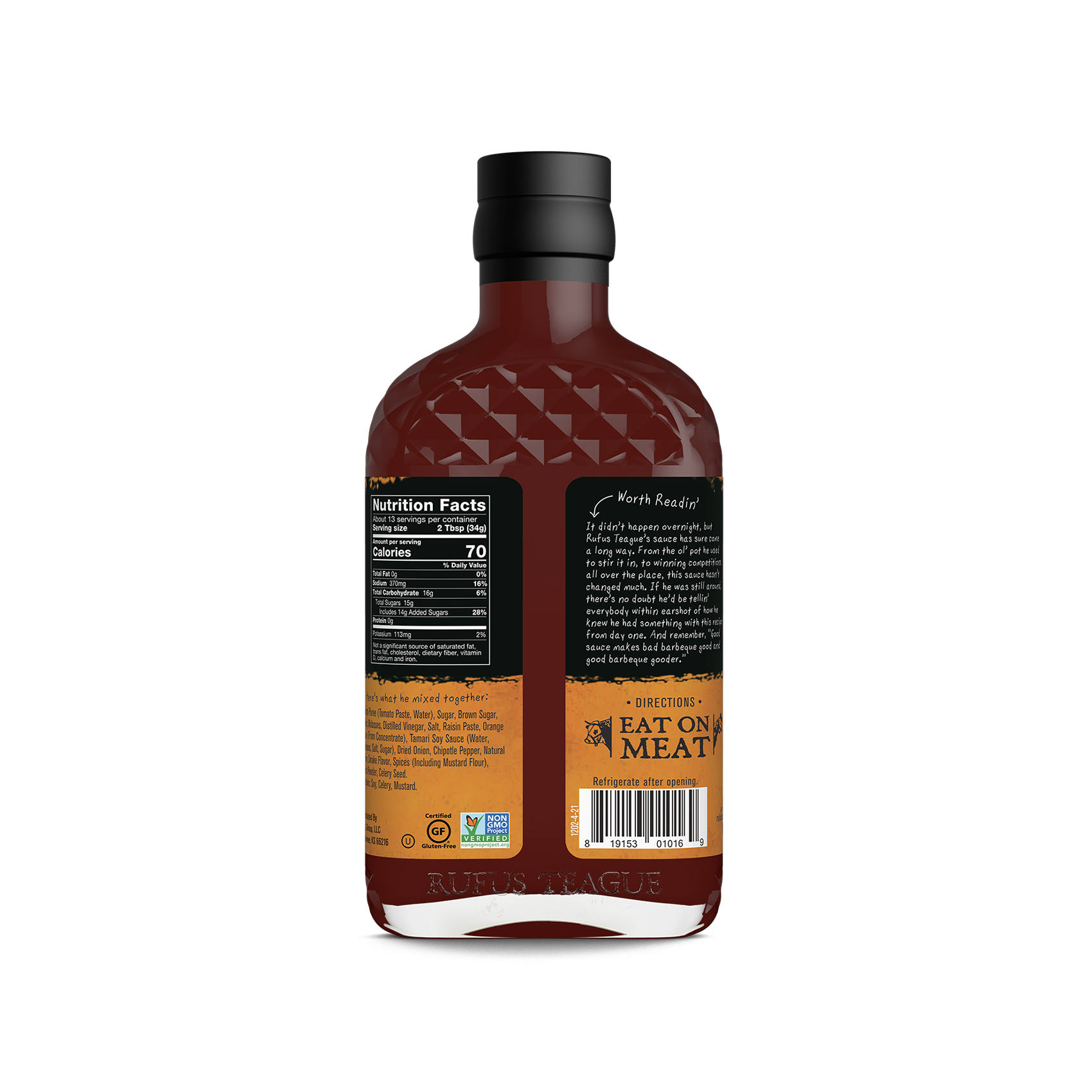 This is the real deal, not some cheap knockoff. As with all Rufus Teague sauces, we cook them longer, so they are less watery, and the flavor is more intense. Made with the finest natural ingredients, our sauce has a classic tomato-base and sweetened with real sugar and molasses. Chipotle pepper gives it just the right amount of kick. So, make your food happy and remember, “Good sauce makes bad barbecue good and good barbecue gooder.”