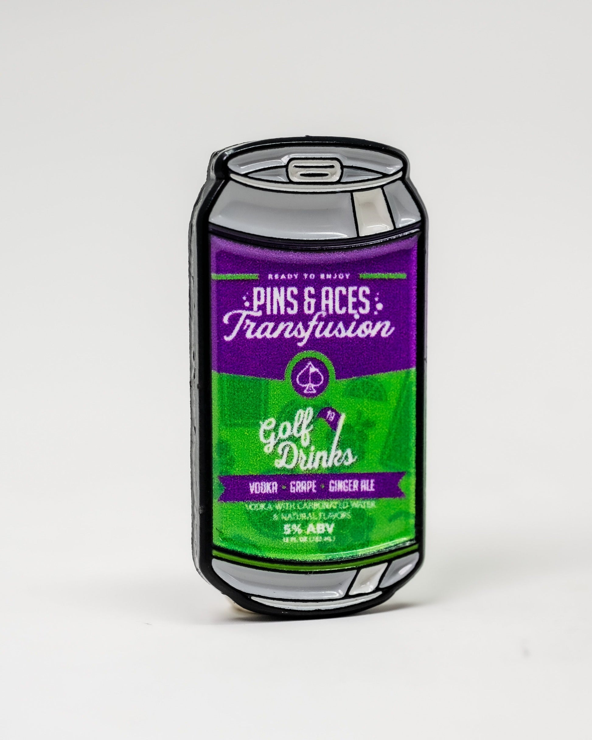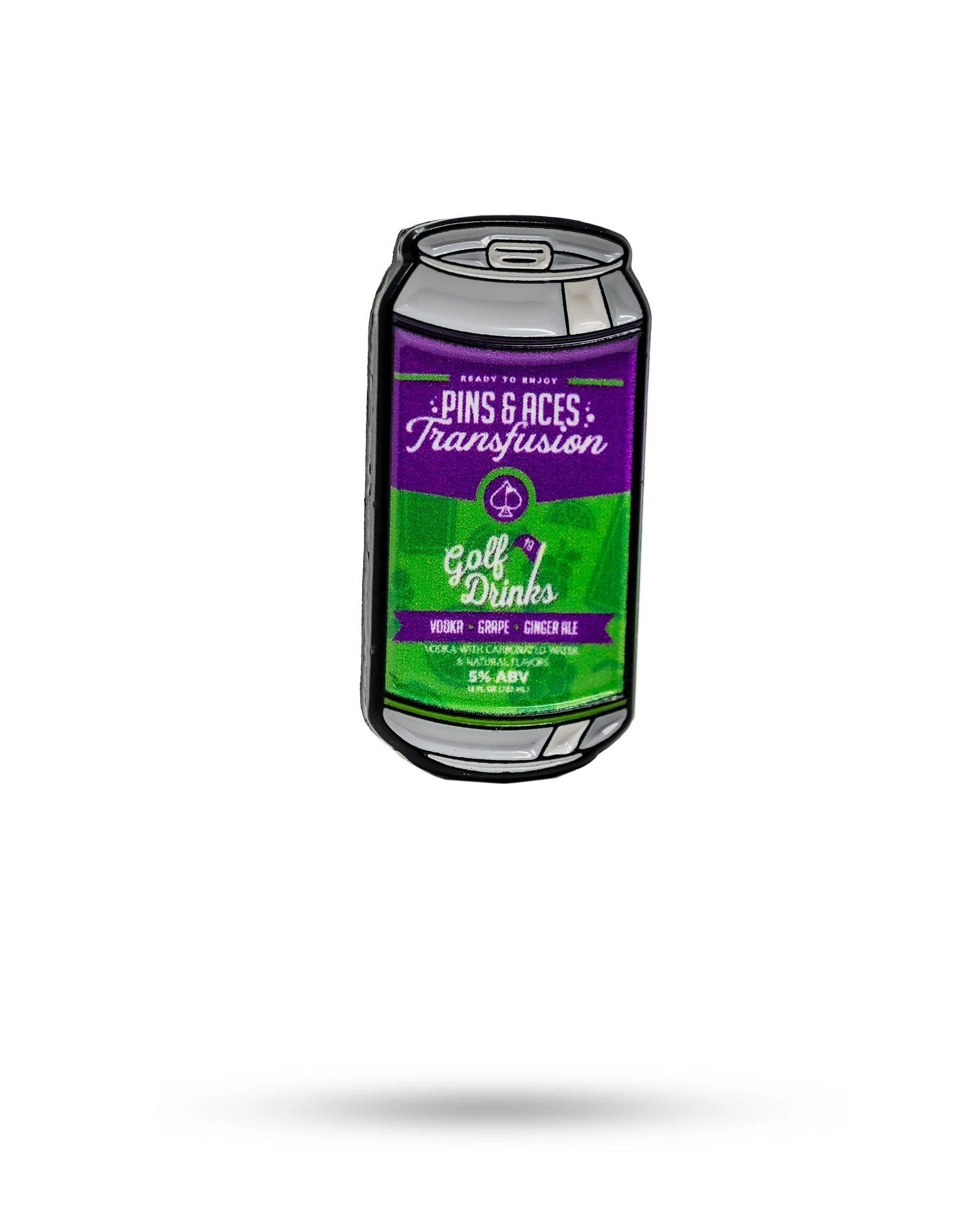 Pins and Aces X Golf Drinks transfusion spade logo. We collaborated with our local friends at Golf Drinks to make an amazing tasting canned transfusion. Our collection features a polo, graphic tee, hat and two ball markers.