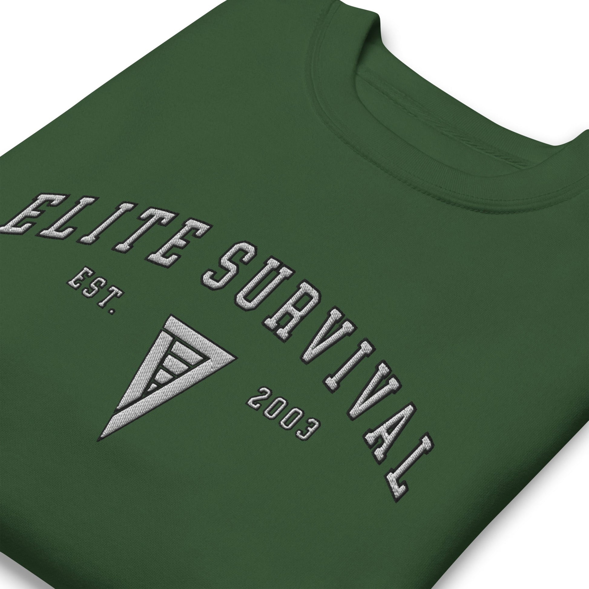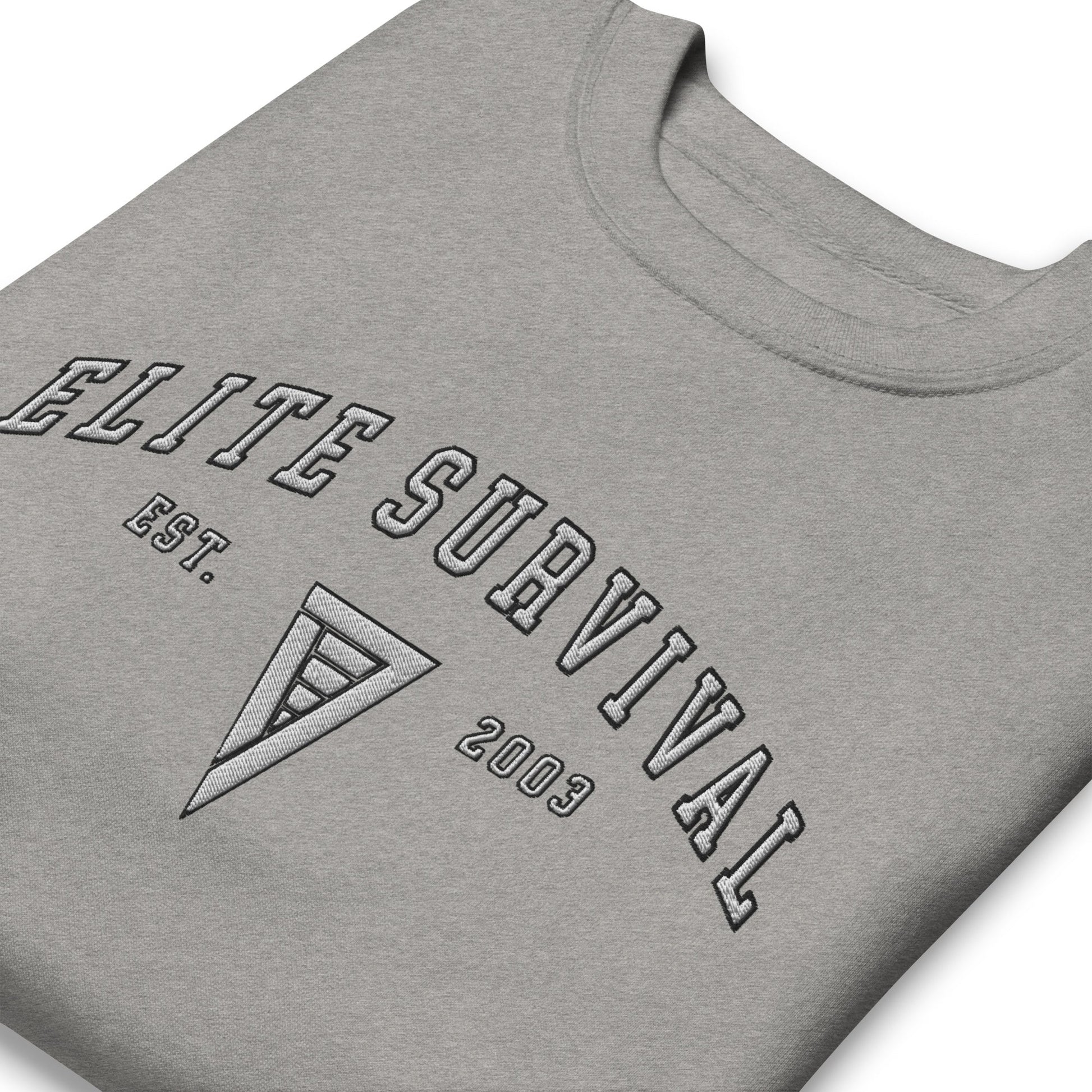 Classic sweatshirt silhouette with ribbed crew neck, long sleeve cuffs, and a flat hem. Elite Survival and Emblem embroidery. Layer it up or wear it on its own for a contemporary streetwear look.