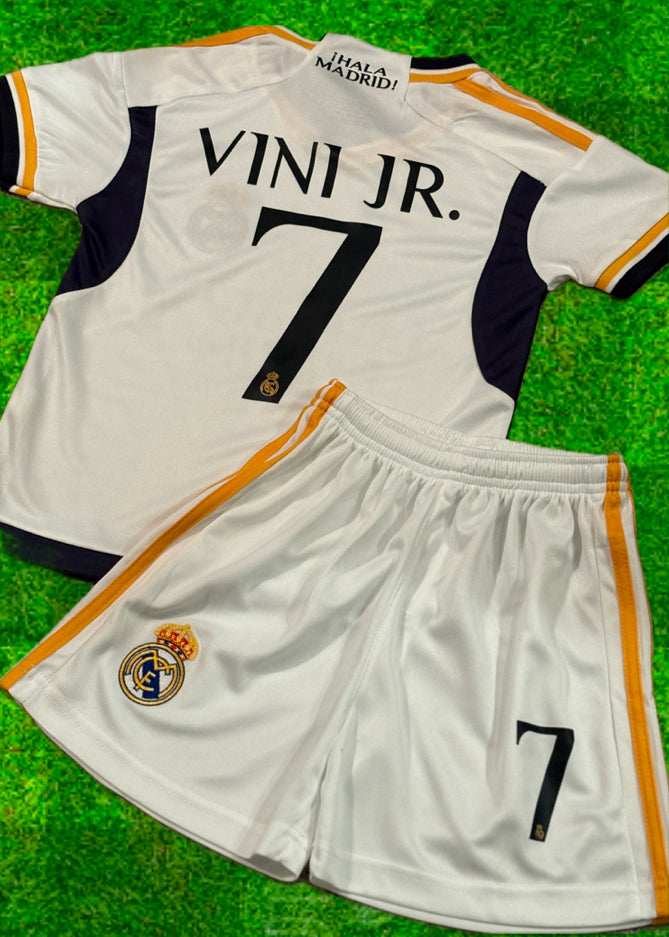 Vini Jr. Kids Soccer Jersey & Shorts Set – Real Madrid (White with Gold Trim)
