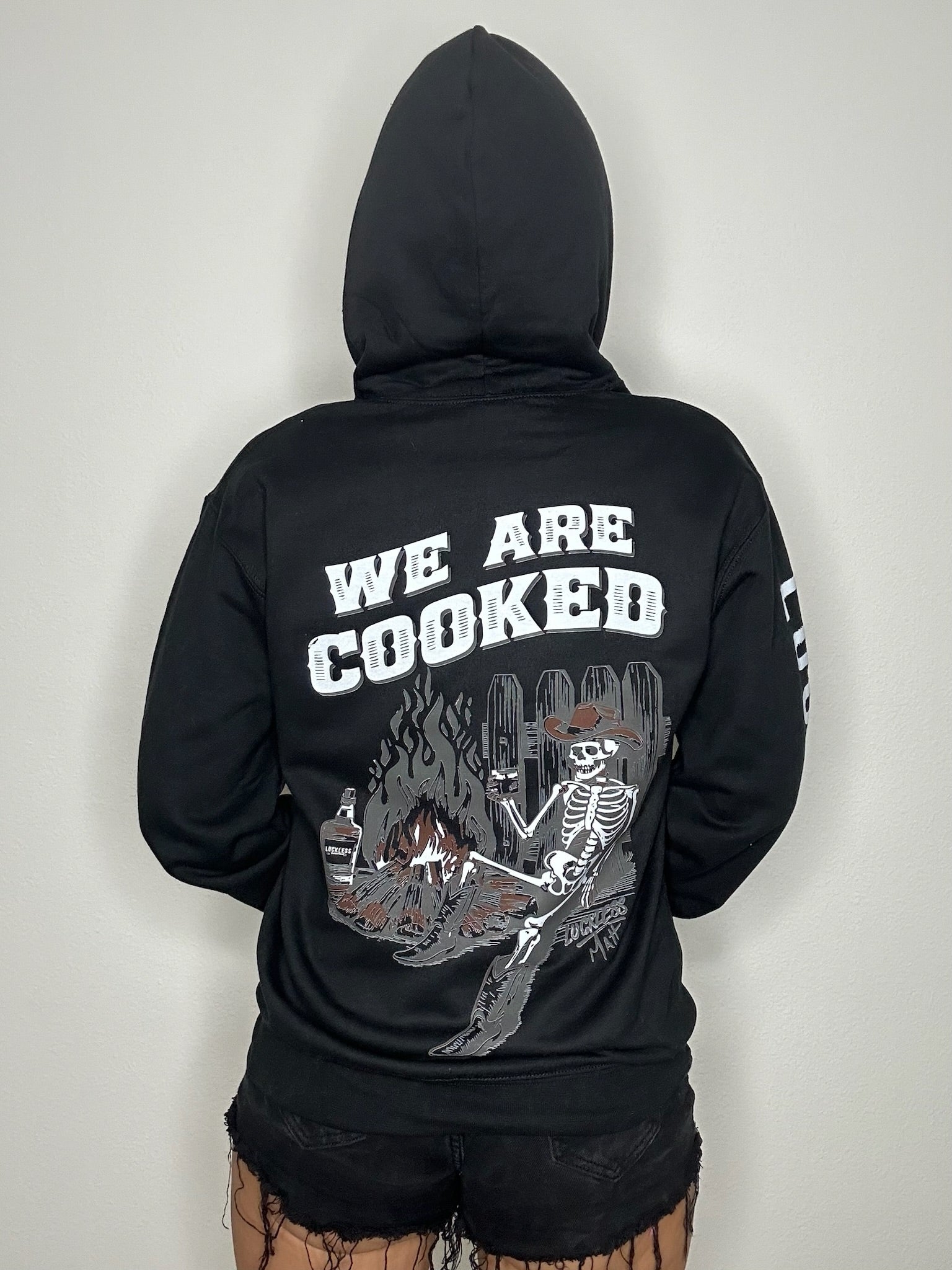 For the late nights under open skies, this black hoodie gets it. Featuring a skeleton in a cowboy hat kicking back with whiskey by the bonfire, it’s made for those who know how to burn the candle at both ends. Built tough with a 50/50 cotton-poly blend, it’s soft, durable, and ready for anything—whether you’re working hard or winding down. A unisex fit for cowboys and cowgirls alike, it’s perfect for anyone who knows life out there gets a little "cooked." Throw it on, pour one up, and let the fire roll.