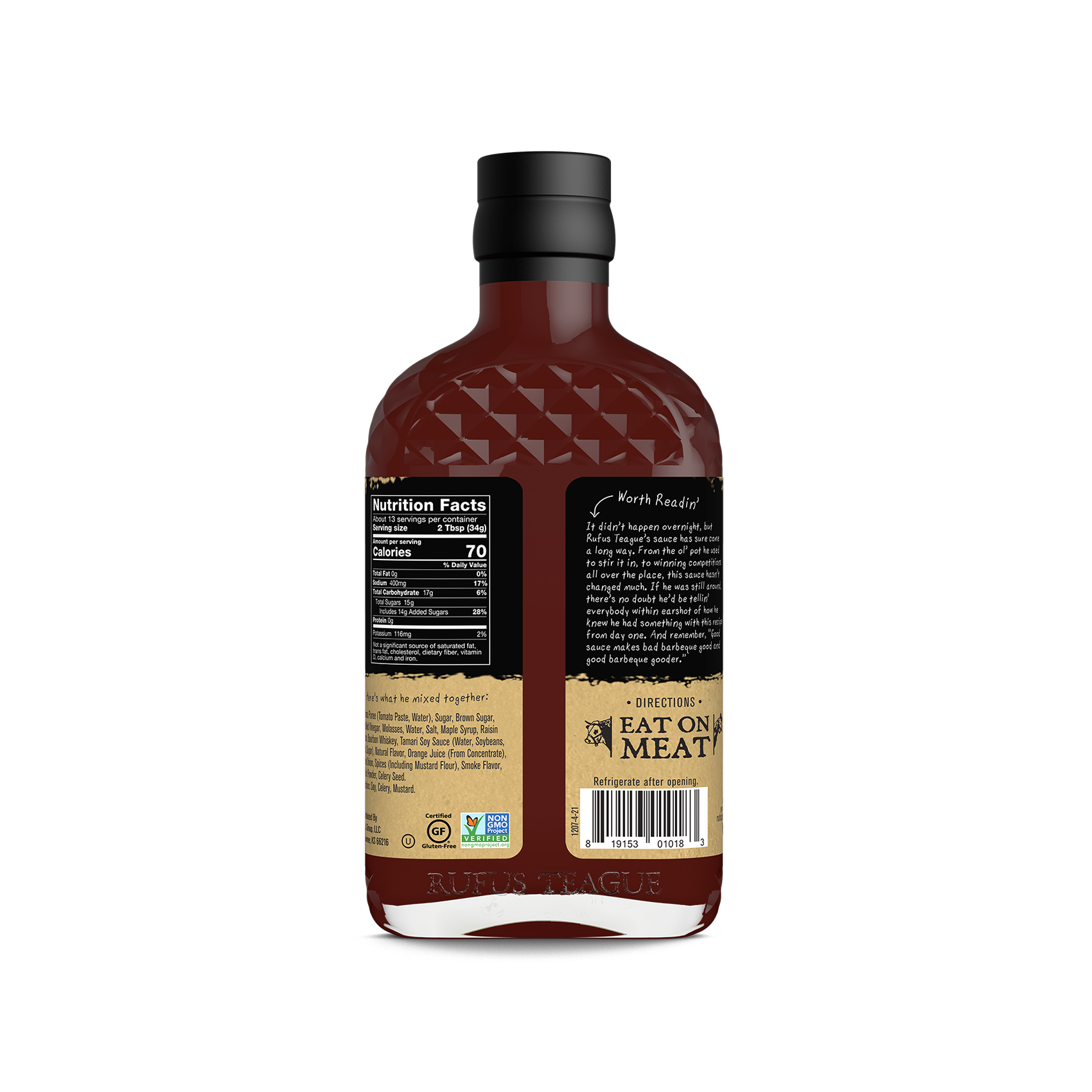 This is the real deal, not some cheap knockoff. As with all Rufus Teague sauces, we cook them longer, so they are less watery, and the flavor is more intense. Made with the finest natural ingredients, Whiskey Maple has a classic tomato-base and is sweetened with real sugar and molasses for a deep and distinguished taste. So, make your food happy and remember, “Good sauce makes bad barbecue good and good barbecue gooder.”