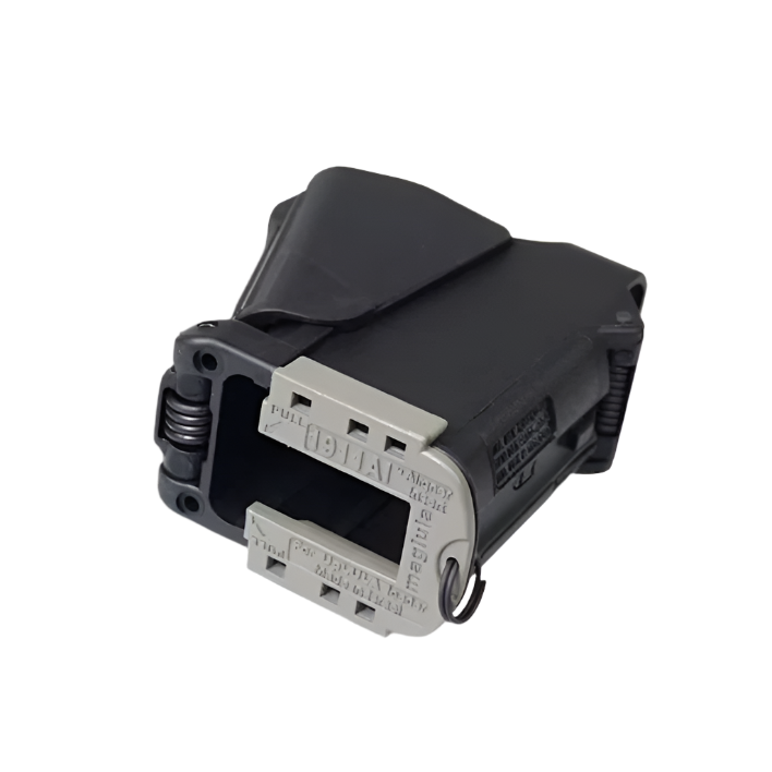 You connect the 1911AI Aligner Insert to the ring of the loader and thereafter it can be ‘clicked’ to the bottom of the loader to narrow it when using single-stack magazines. You can easily release it when loading wide-body mags.