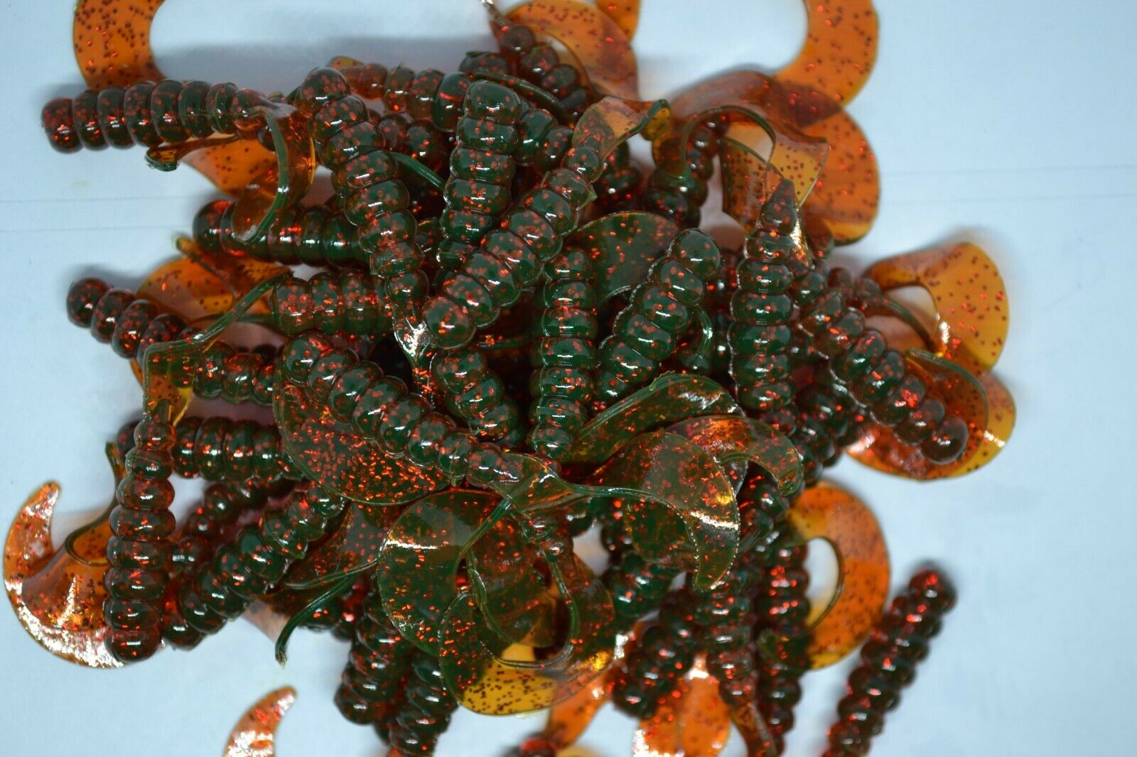 35 count pack of 2 inch Curly Jig in Motor Oil color as pictured.