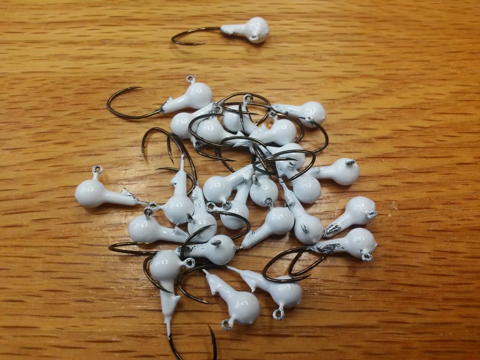 35 pk. 1/16 oz. Cam's White Painted Jigs with Collar and #2 Bronze "NASTY BEND HOOKS"