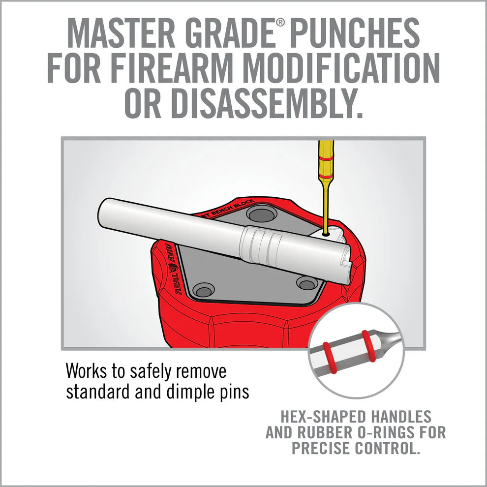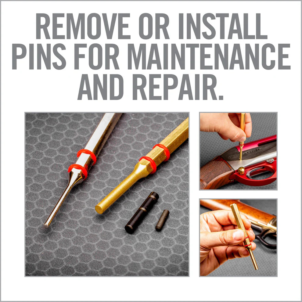Gunsmithing punches are core tools needed to modify or disassemble firearms. The Accu-Punch 11-Piece Standard Brass & Steel Pin Punch Set is designed from the ground up to work better with firearms. The punches are made of brass and hardened steel with a nickel plating to resist corrosion. The hex-shaped handle and rubber O-rings provide precise control during use.