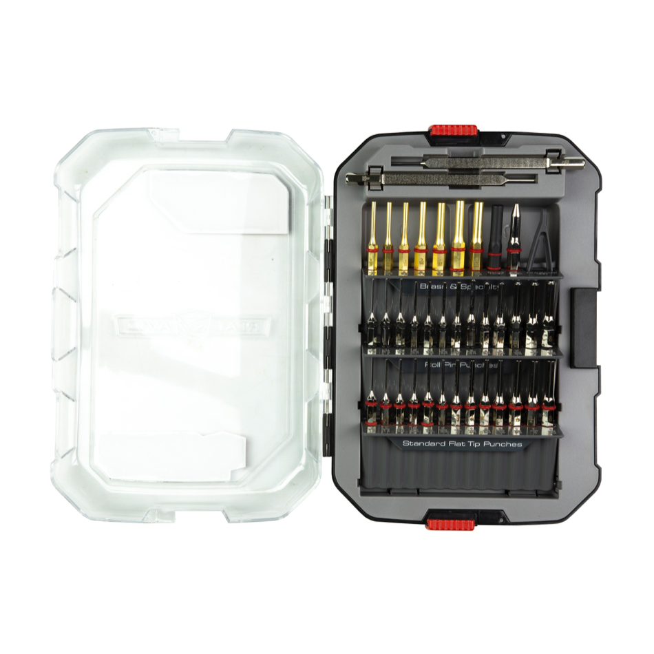 All punches are clearly labeled. Rubber o-ring ensures a secure grip, prevents slippage and reduces the risk of marring. The entire set is organized in a durable, easy-access case, helping you stay organized and eliminate clutter on your gunsmithing bench. and making it easy to access all the tools.