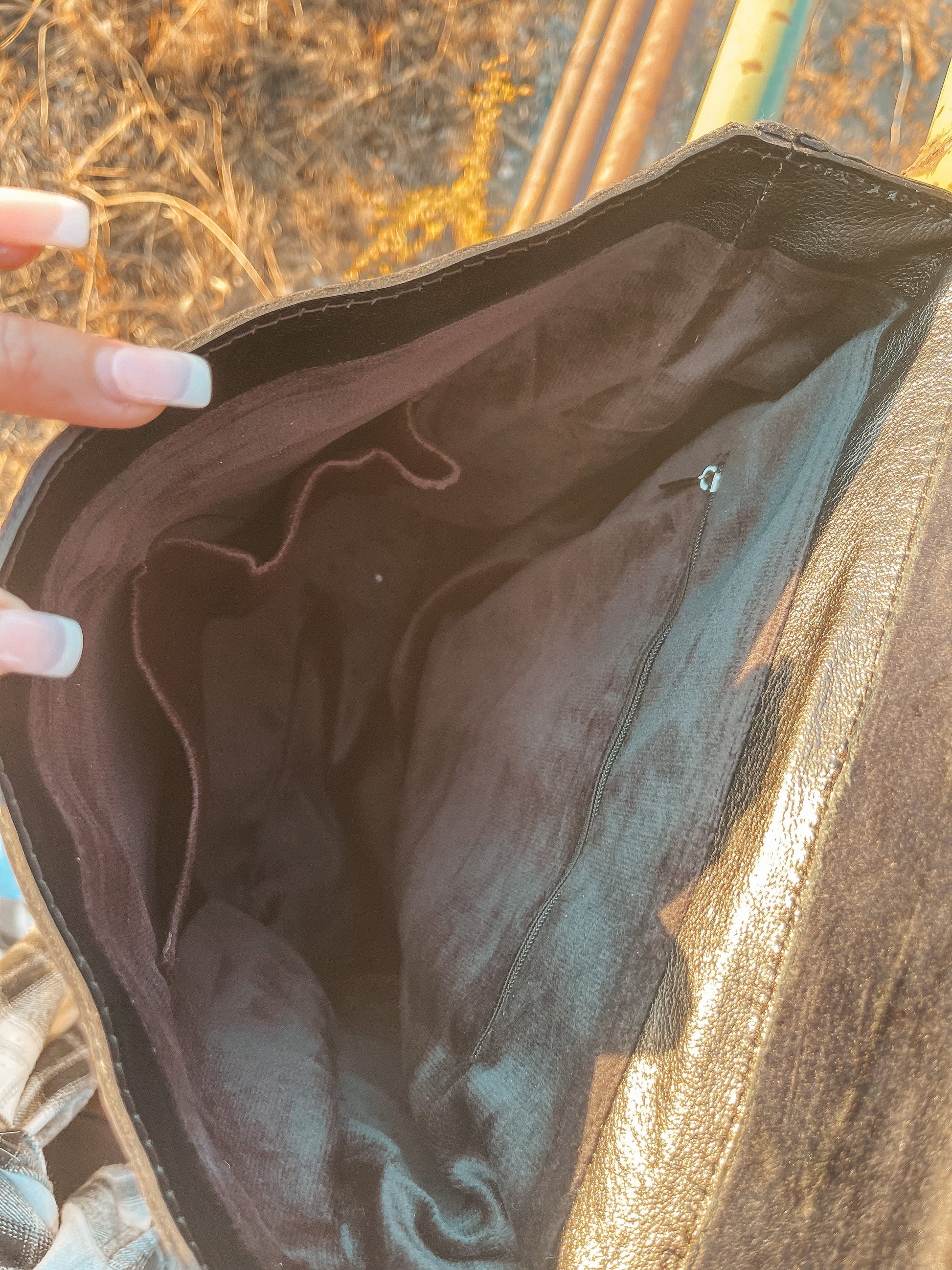 The interior is black velvet, and has one zipper pocket and two cubby pockets.
