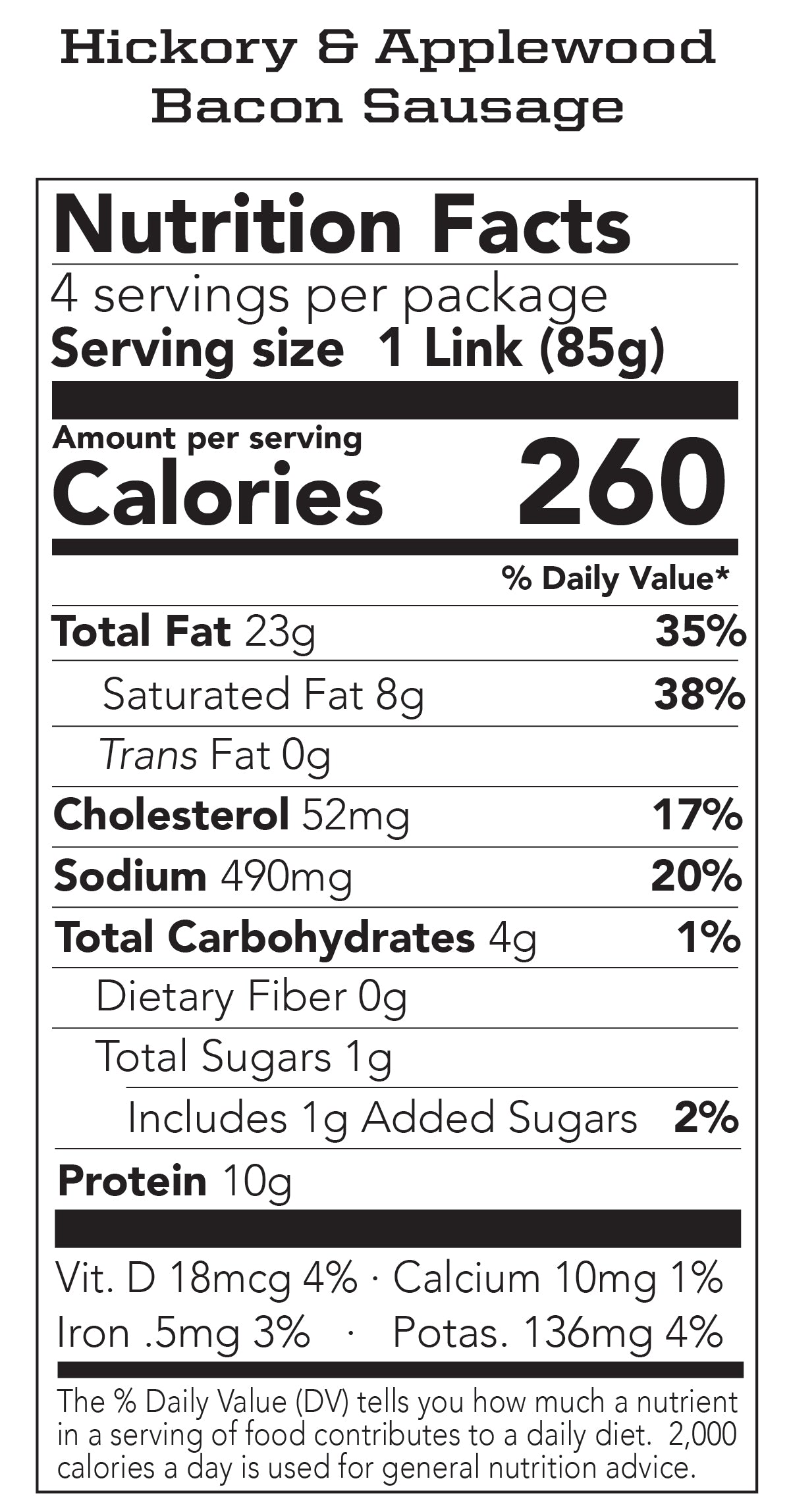 - Chicken & Bacon - Our lowest fat & calorie sausage. Nearly half the fat and calories compared to our Hickory & Applewood, we still add nitrate-free bacon we just substitute all the pork with Gap 2 certified chicken white meat tenderloins. A great all around cooking or on-a-bun sausage, perfect for adding flavor to any dish with vegetables, pasta or gain dishes, soups, and stews.