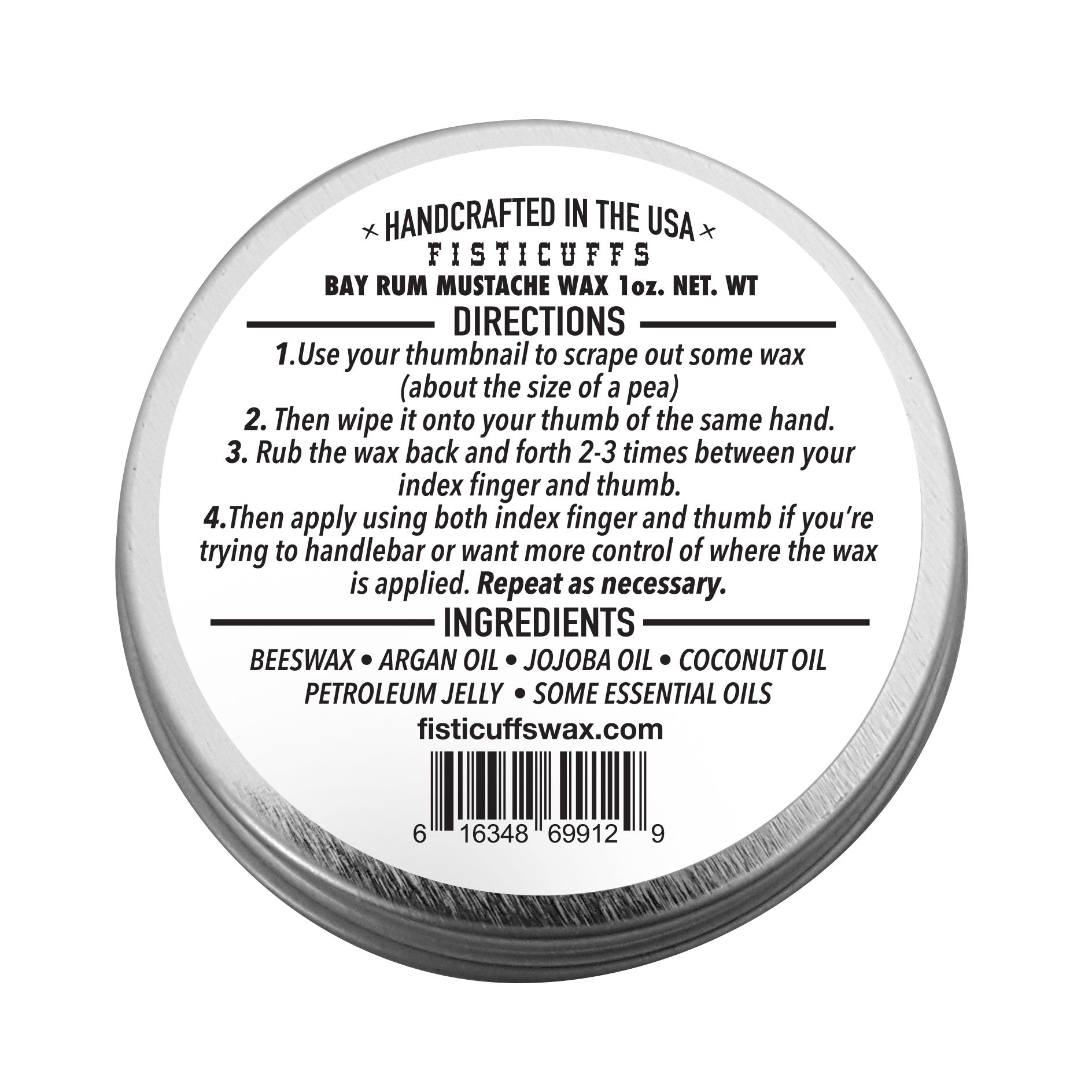 1 ounce of Bay Rum scent Fisticuffs Mustache Wax hand poured into a round tin.