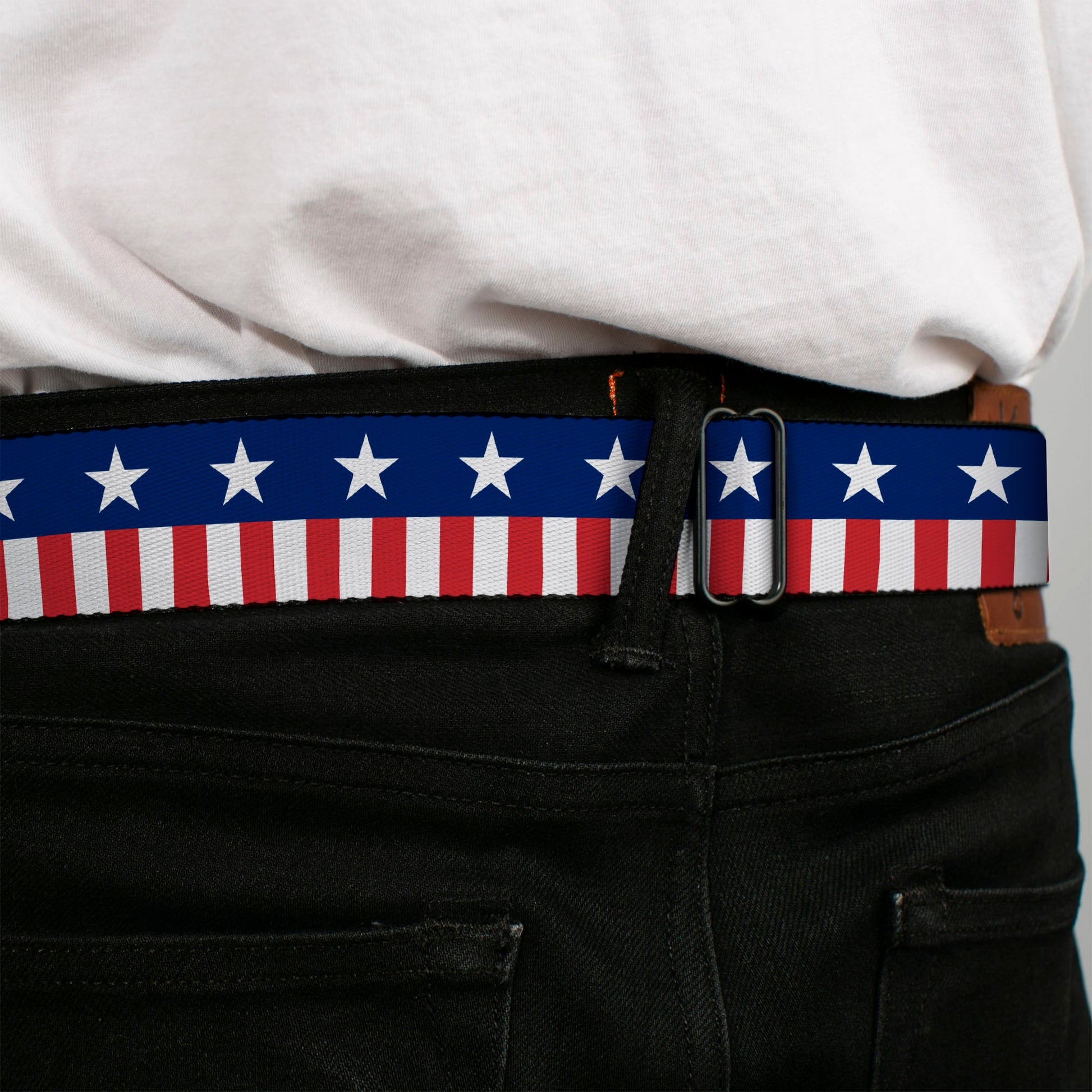 BD Wings Logo CLOSE-UP Full Color Black Silver Seatbelt Belt - Americana Stars & Stripes2 Blue/White/Red/White Webbing