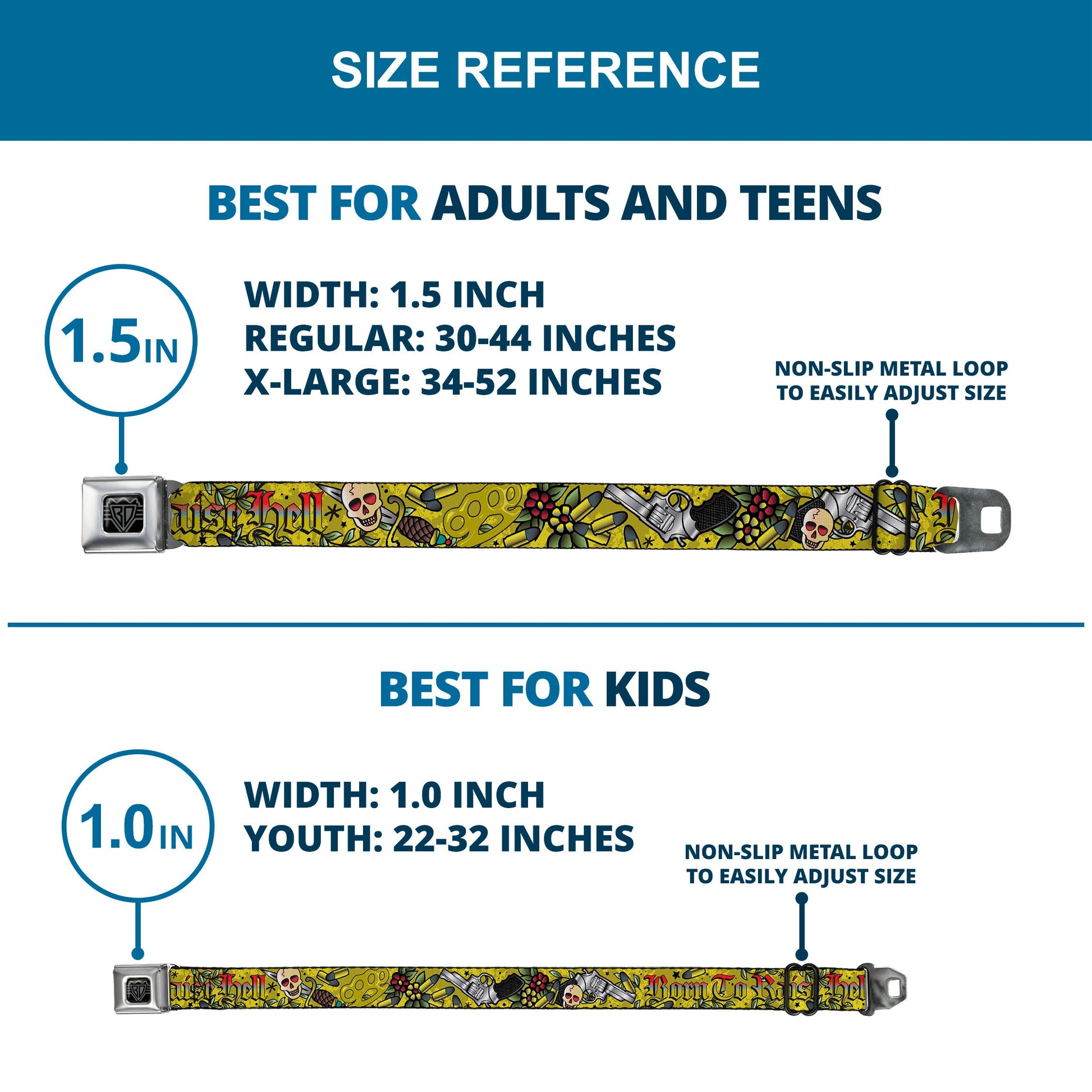 - Our adult-size Seatbelt Belts are 1.5 inches wide and our kid-sized Seatbelt Belts are 1.0 inch wide.