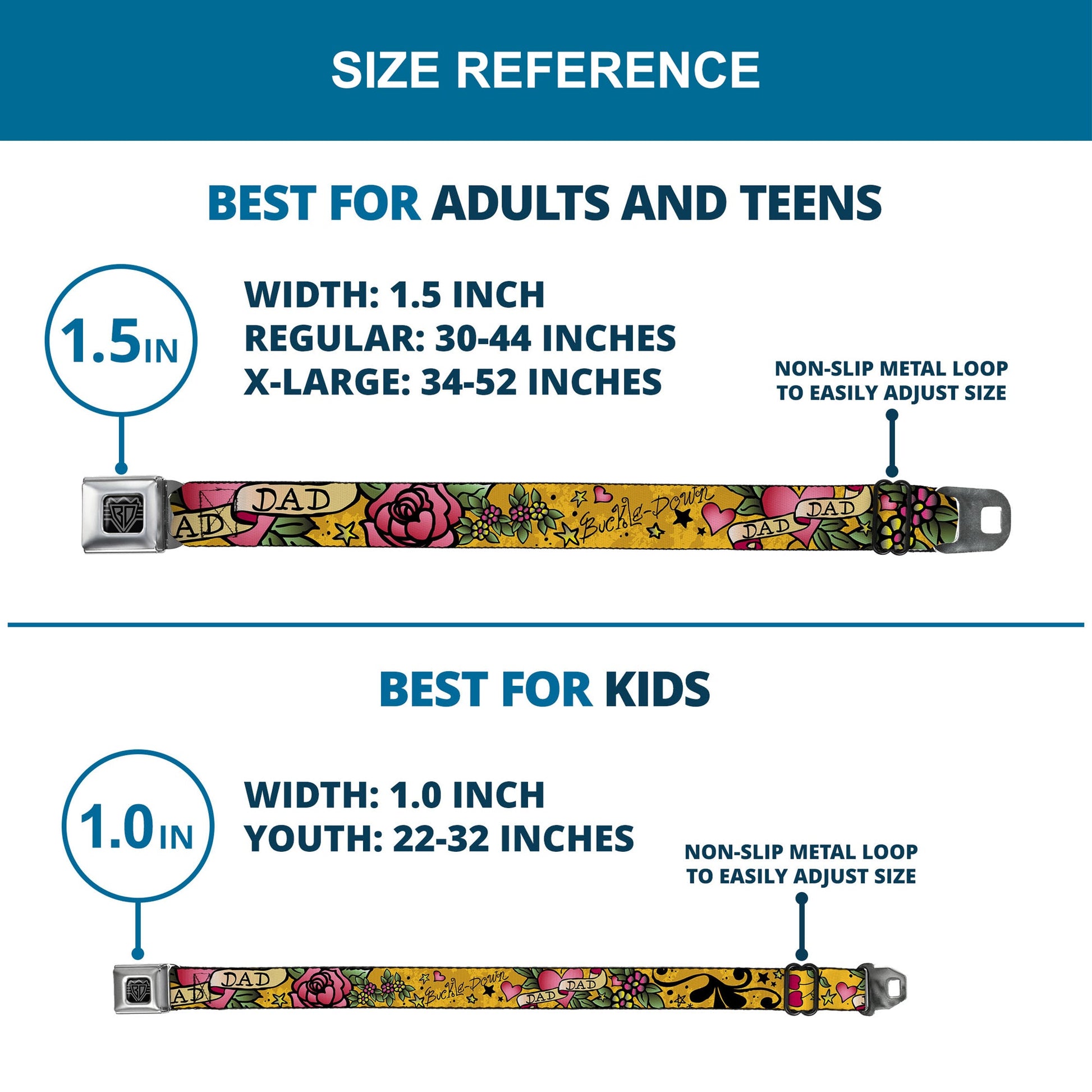 - Our adult-size Seatbelt Belts are 1.5 inches wide and our kid-sized Seatbelt Belts are 1.0 inch wide.