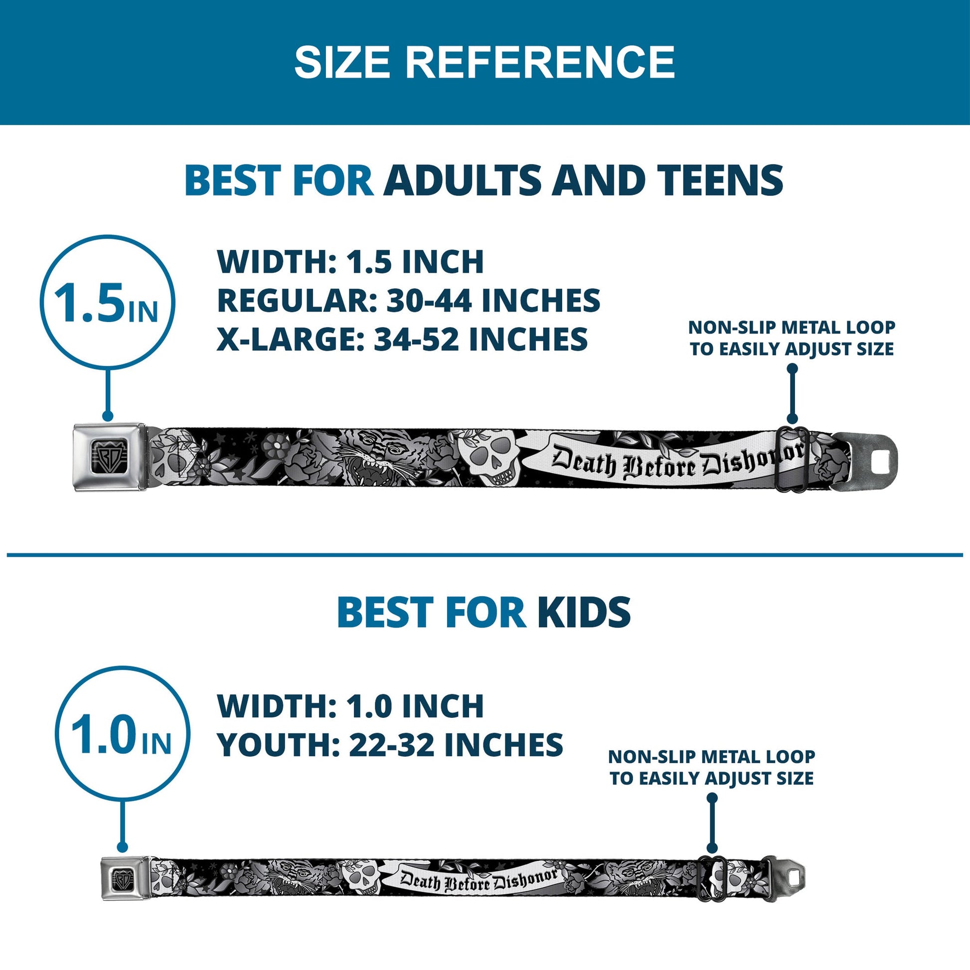 - Our adult-size Seatbelt Belts are 1.5 inches wide and our kid-sized Seatbelt Belts are 1.0 inch wide.