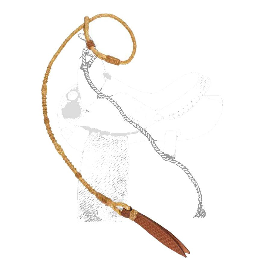 Braided rawhide "Over & Under" rope whip with braided knots. Adjustable loop to go over the saddle horn. 4' long with 8" popper. Perfect for barrel racing or other timed events as well as for the anyone who needs something to help move their horse along.