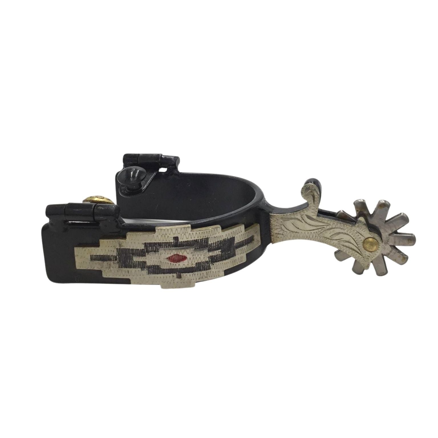 A black steel spur that fits a boot well, with a nickel silver overlay, hinged swinging buttons. These spurs have our new, super-flow "Gate Hinge" buttons that are preferable to the traditional style. 1" band, 2" shank and 1 1/2" twelve point rowel.