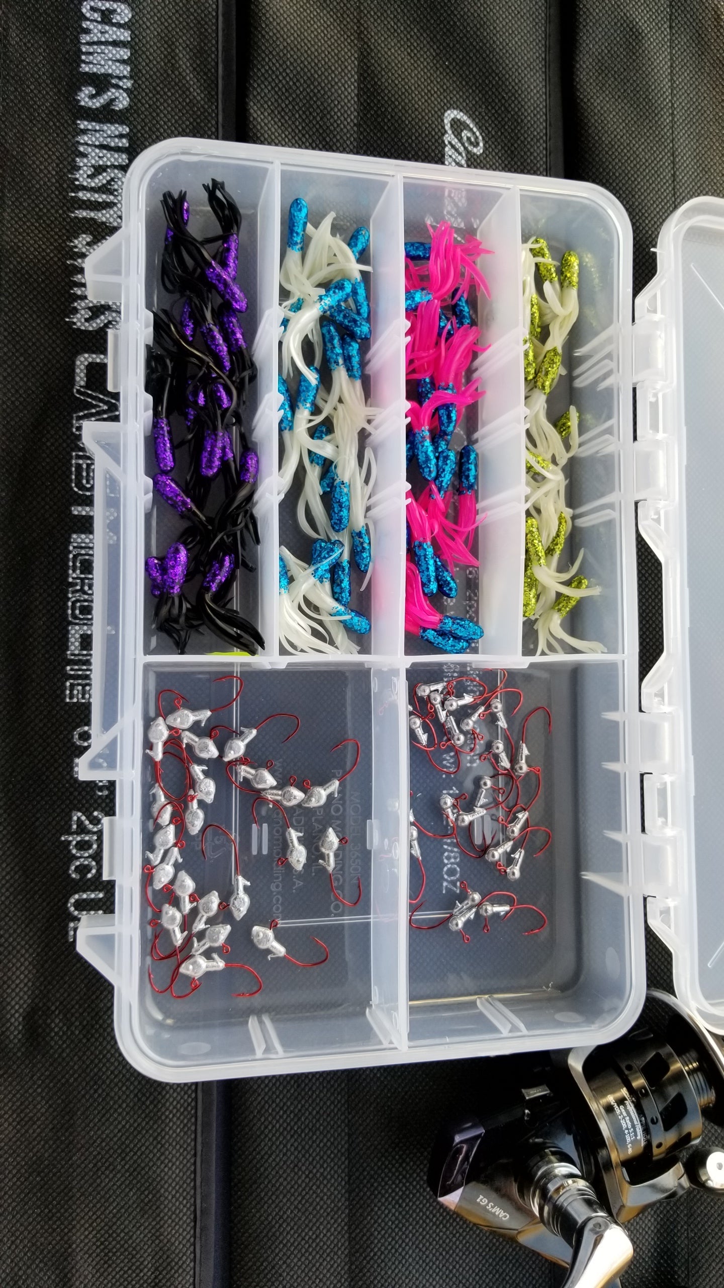 My new Cam's 1.5 inch "Muddy Water Tube" assortment package is great for those that fish deep water of murky water. Plus we add our world Renowed Nasty Bend Hooks to give you best of both worlds. "Our now world renowed "Nasty Bend Hooks" 20 ct. 1/16 minnow Head #4 hook + 1/32 Round Head with #4 Hook, also included are 4 of our most popular proven crappie catching exotic super soft plastic Muddy water tubes 100 pieces total. All comes in a reusable Plano box with 6 compartment for easy organization,