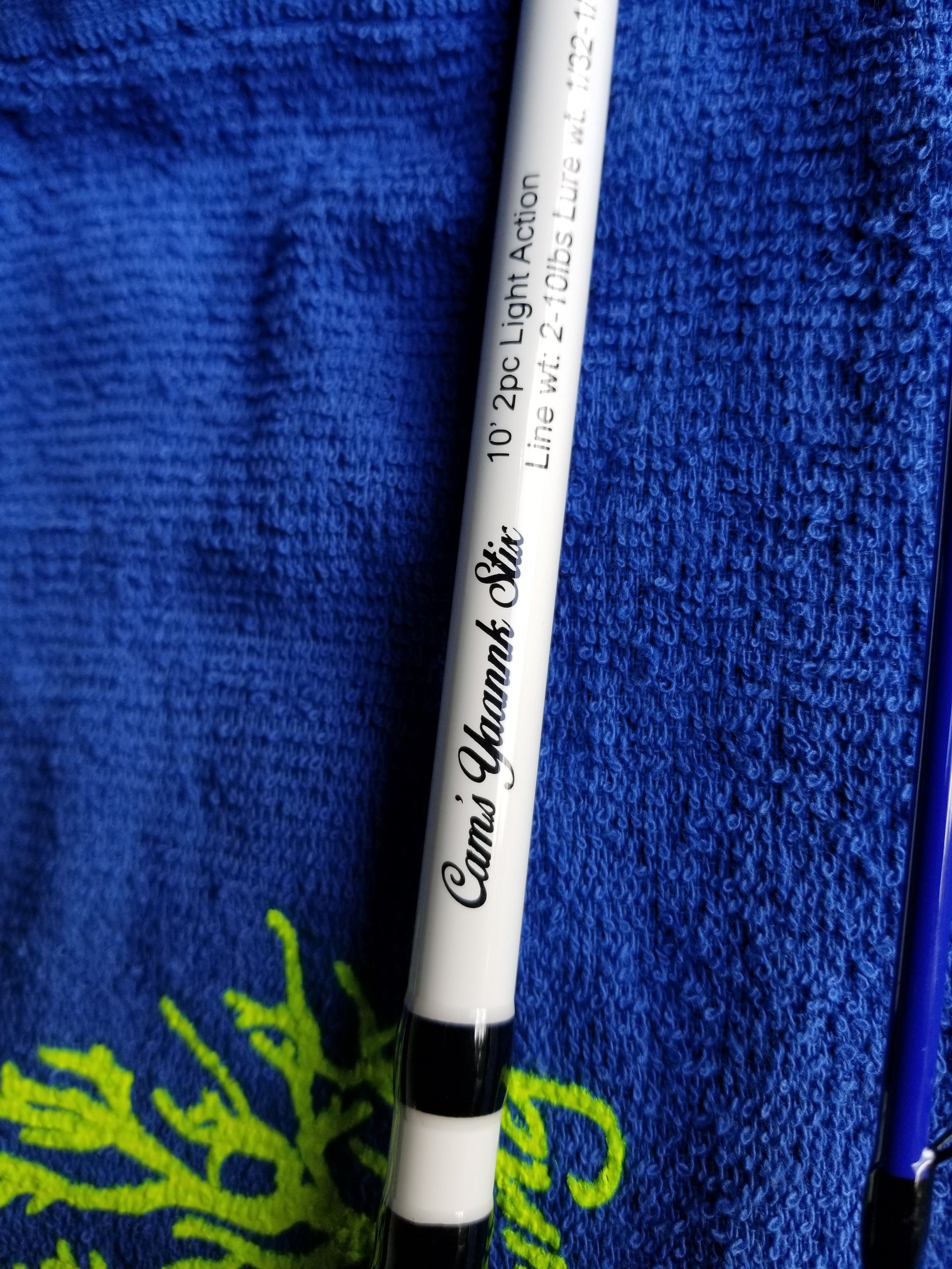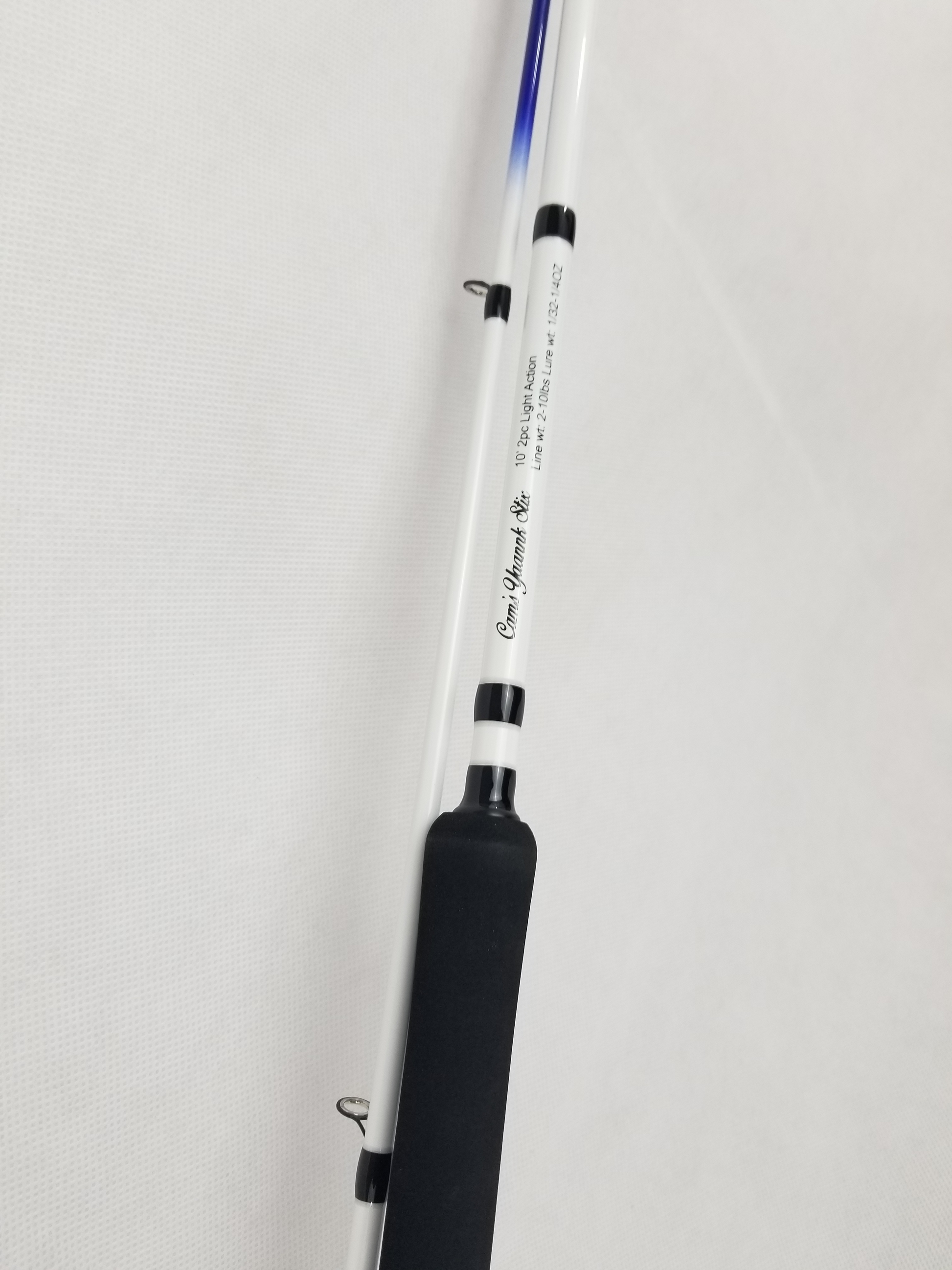 Cam designed this two-piece Yaannk Stiks for being a ultra sensitive and light, rod with premium 2-piece IM-8 White & Blue Caron Fiber blanks. Even the smallest tap is easily felt so you can set the hook. Brass-plated aluminum oxide guides allow smooth line flow. EVA Soft to the touch handle. Use for casting, jigging, trolling, bobber stopping. Handcrafted and specifically made for vertical jigging.