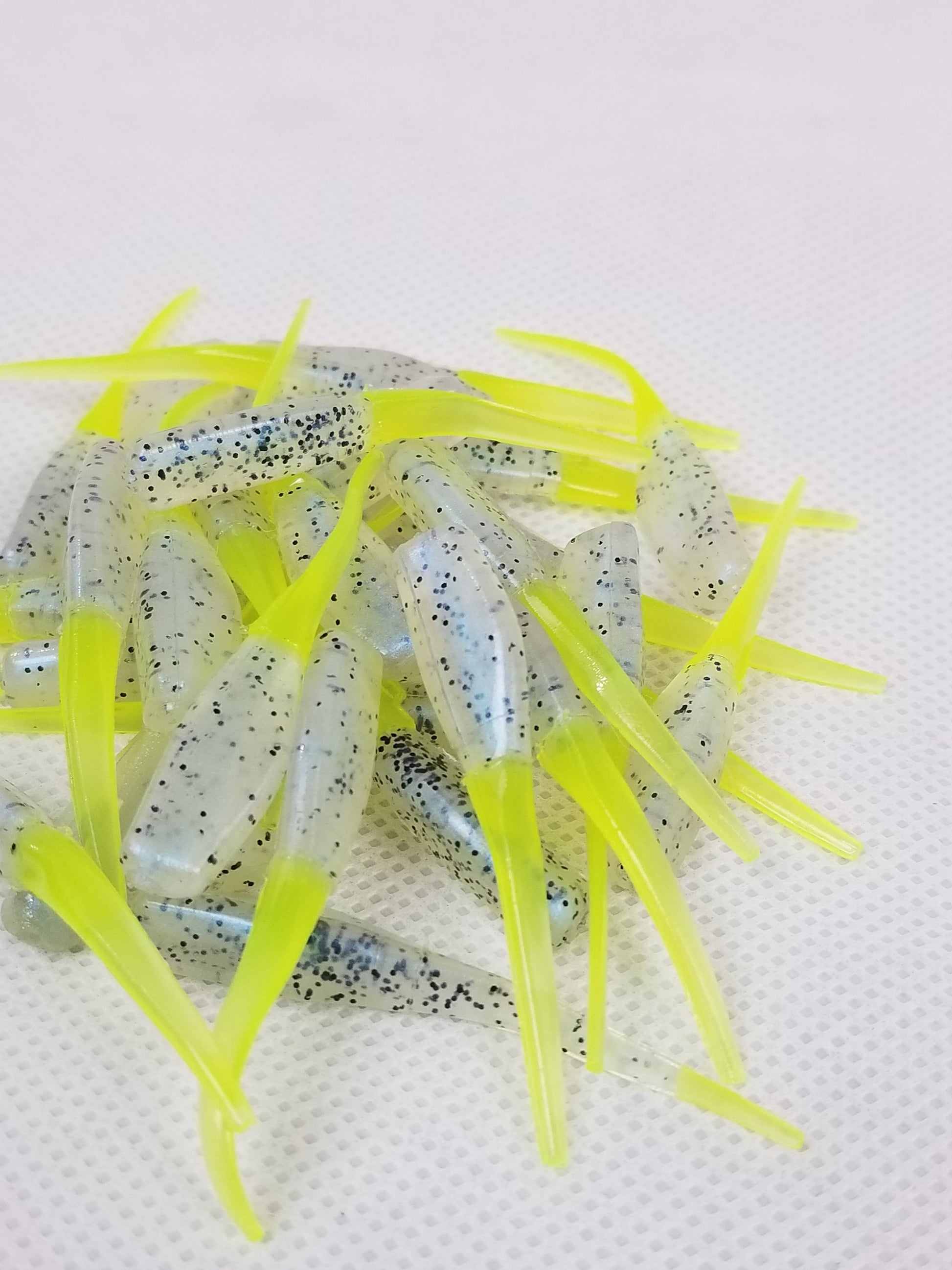 CAM's 2" STINGER SHAD HAND POURED AND MADE OF HIGH QUALITY SOFT MATERIAL.... THESE ARE A MUST FOR CRAPPIE FISHERMAN... YOU PUT THESE IN THE WATER WITH OUR NEW AND THERE IS NO WAY TO KEEP THEM FROM WIGGLING Soft plump body section with a single pointed tail is a near perfect imitation of a baby shad...Its dancing Perpetual motion will pull in crappie and panfish quick. ONLY AVAILABLE HERE!